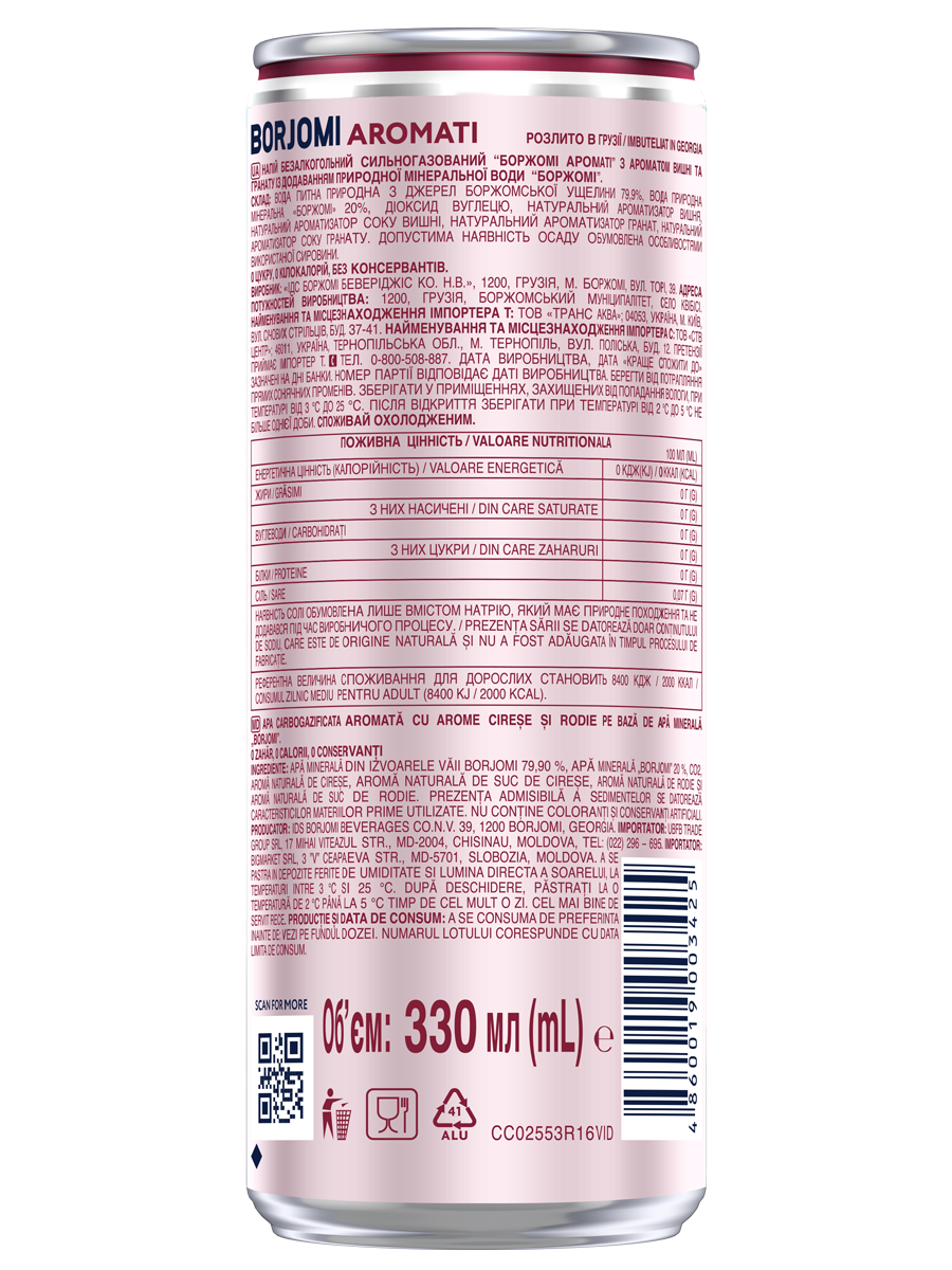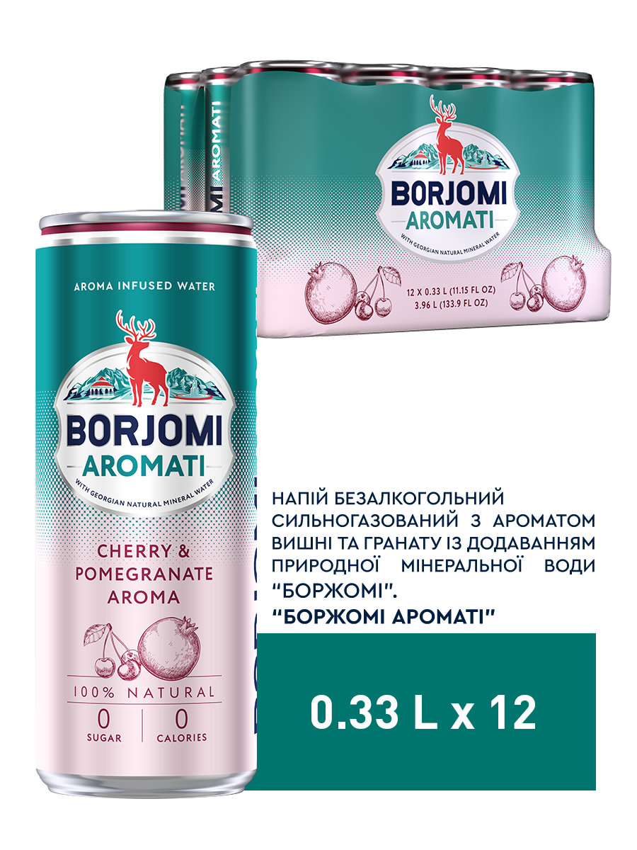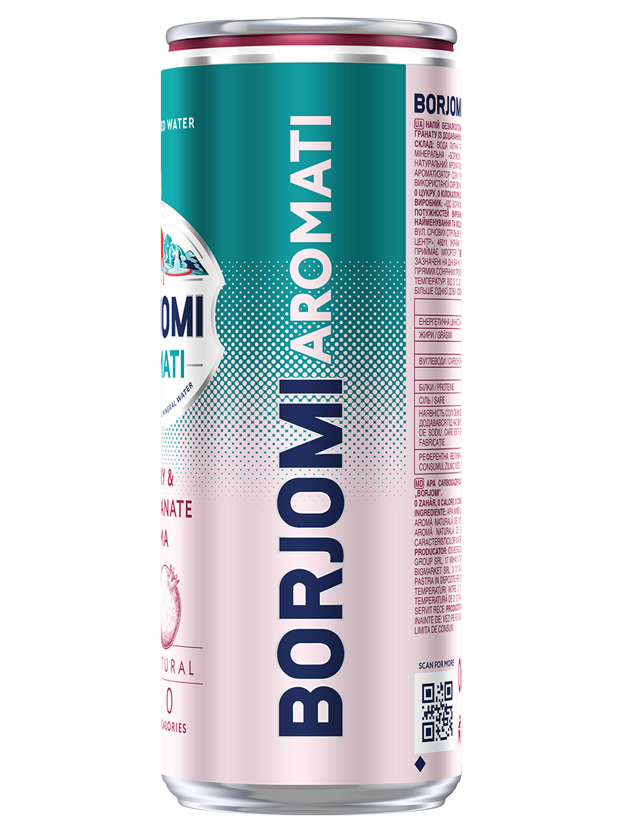 Borjomi Aromati — це нова сторінка в історії легендарного бренду, де перевірену часом природну мінеральну воду Borjomi ми насичуємо натуральними фруктовими ароматами. Borjomi Aromati створено для тих, хто прагне щоденного здорового освіження без компромісів: 0 цукру, 0 калорій, 100% натуральні інгредієнти у складі.