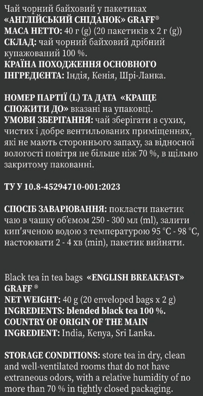 Це втілення багатовікової традиції та неповторного смаку, який збуджує дух і наповнює ранок енергією. Створений з унікальної суміші найкращих сортів чорного чаю з Індії, Кенії та Шрі-Ланки, кожен ковток чаю «Англійський сніданку» пропонує глибокий, насичений смак із м'якими нотками.