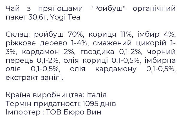 Чай з прянощами Ройбуш — аюрведичний напій. Має насичений пряний смак і мʼякий травʼяний аромат. Основний компонент — ройбуш — отримують з південноафриканського чагарнику, назва якого в перекладі звучить як «червоний кущ». Саме завдяки йому напій має характерний колір. Прянощі (кориця, імбир, кардамон) додають напою глибини й пікантності смаку. Ройбуш не містить кофеїну, тому підходить для вживання у будь-яку пору доби.