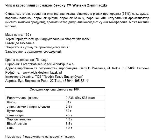 Хрусткі, смачні чипси Wiejskie Ziemniaczki в польських традиціях. Поєднання ароматних спецій та інгредієнтів дають змогу зрозуміти, чому снеки Wiejskie Ziemniaczki зникають миттєво. Достатньо скуштувати Wiejskie Ziemniaczki, щоб пригадати смак свіжої олії з сіллю, соковитої копченості або зеленої цибулі, що зібрана прямісінько з бабусиного городу.