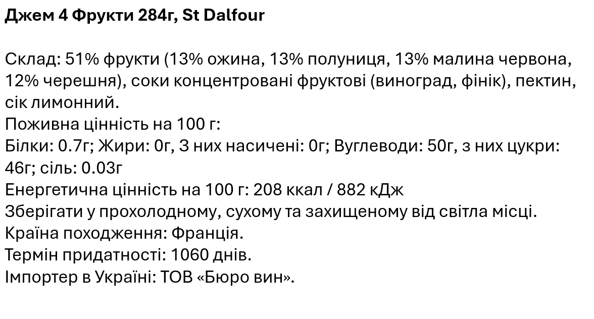 Джем 4 Фрукти створений у Франції за традиційною рецептурою, розробленою у регіоні Аквітанія. До складу входять чотири добірні види фруктів — полуниця, черешня, ожина та малина, які формують насичений смак із природною фруктовою солодкістю та легкою кислинкою.
