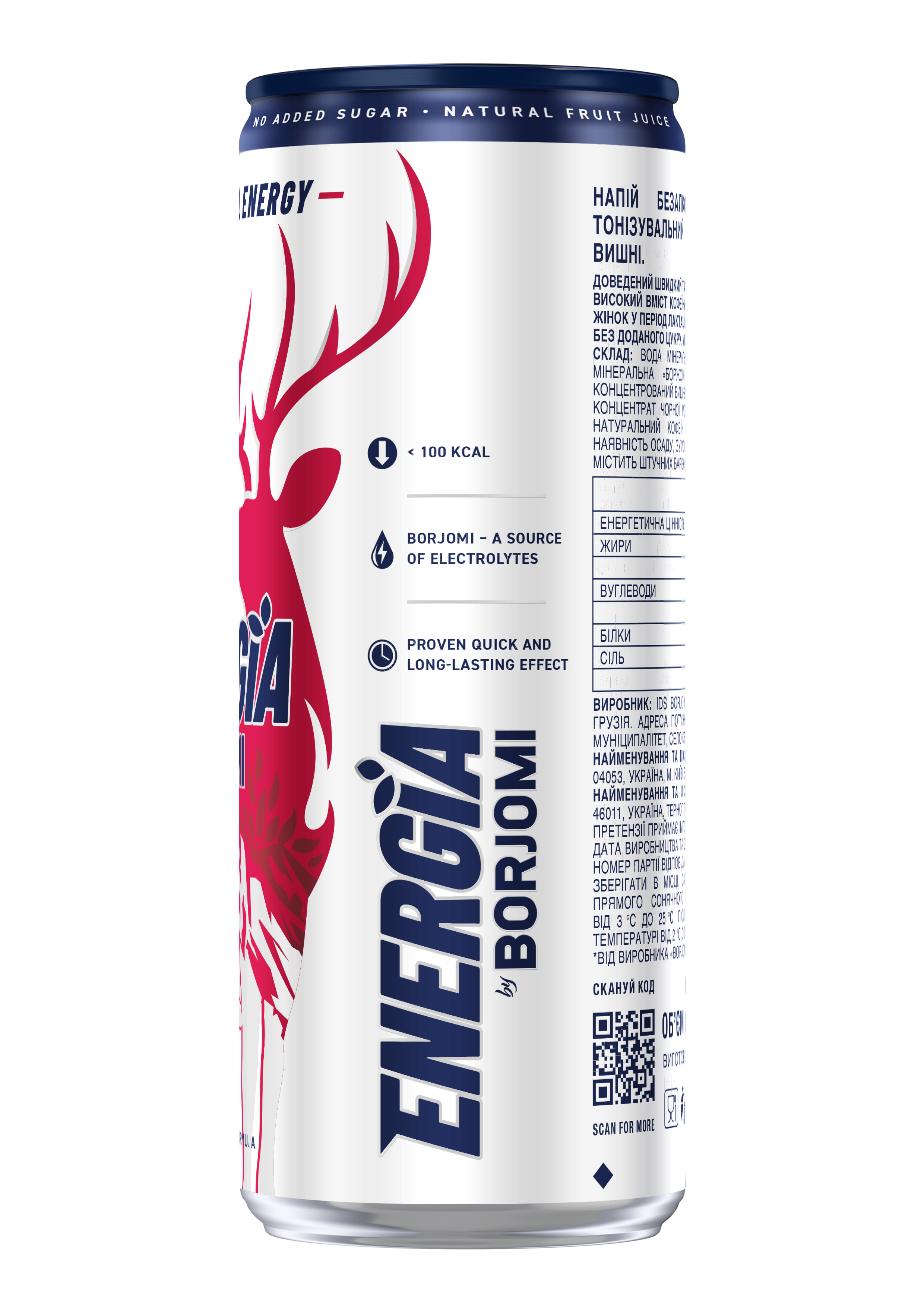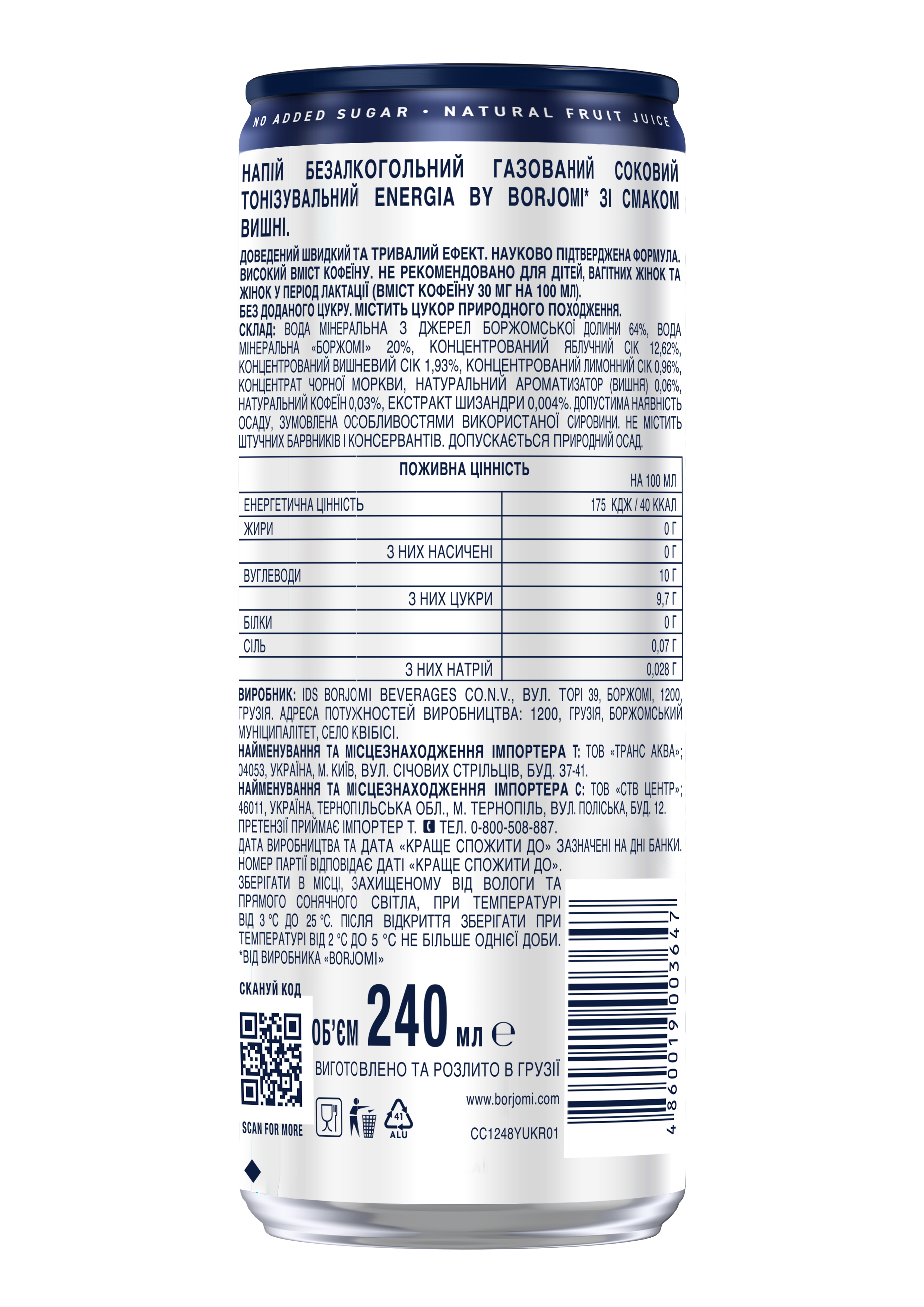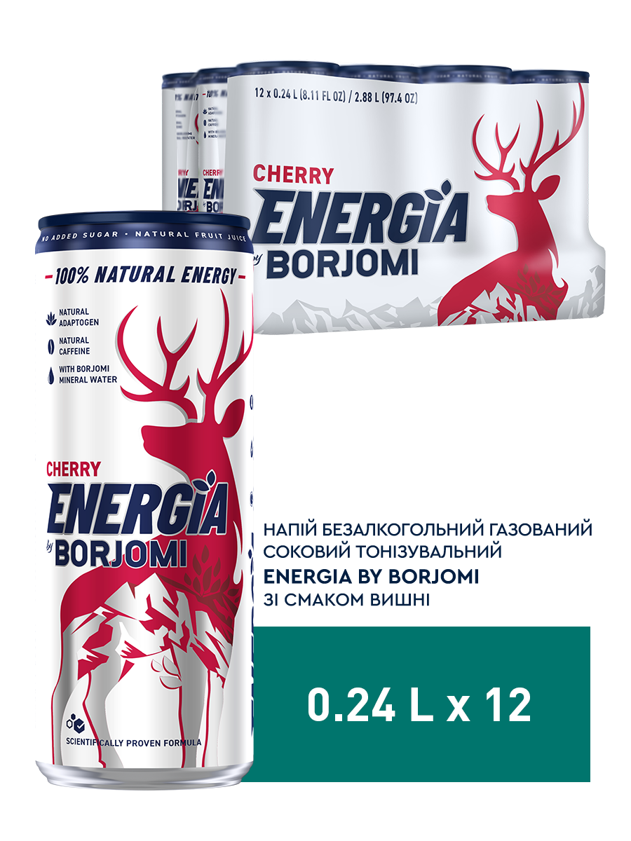 Energia by Borjomi — це функціональний енергетичний напій нового покоління, створений для тих, хто обирає натуральність та високу ефективність. Унікальна науково підтверджена формула на основі мінеральної води Borjomi та природних енегретичних компонентів забезпечує миттєвий заряд бадьорості та тривалу дію. Без доданого цукру, консервантів, штучних барвників та ароматизаторів (100% натуральна енергія у кожній банці).