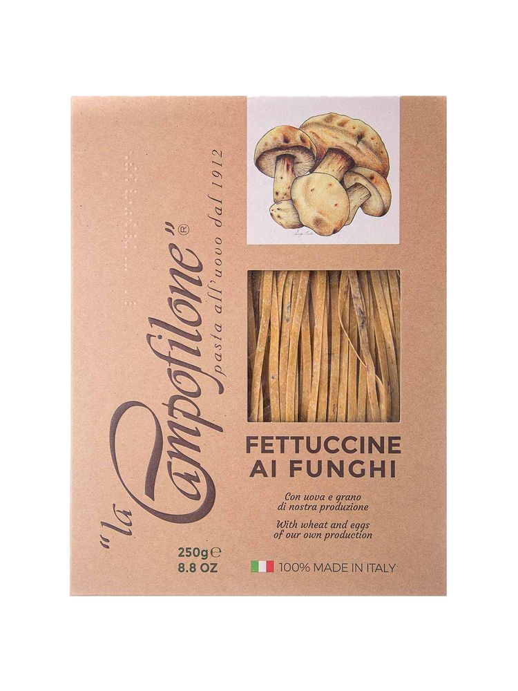 Фетучіні з білими грибами від La Campofilone — це традиційна італійська яєчна паста, виготовлена з борошна з твердих сортів пшениці, вирощеної на власних полях компанії в долині Марке. Яйця, яких у складі цих макаронних виробів має бути не менше 30 %, походять з ферми, що належить бренду. Тут кури перебувають на вільному вигулі та харчуються лише високоякісними збалансованими кормами. Крім цього, паста збагачена натуральними сушеними білими грибами, що додає їй неповторного аромату. Фетучіні необхідно готувати в окропі протягом 1–2 хвилин. Готовий продукт має витончений смак з грибними нотами та щільну еластичну консистенцію. Ідеально поєднується з вершковим соусом.
