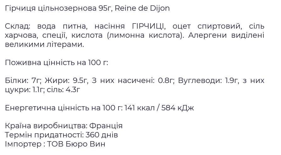 Цільнозернова гірчиця Reine de Dijon стане універсальним доповненням для щоденних і святкових страв. Вона смакує до м’яса на грилі, запеченої курки, ковбасок та навіть риби. Є чудовою основою до соусів та маринадів. А якщо додати гірчицю до салатної заправки, його смак набуде вишуканості, притаманної класичній французькій кухні.