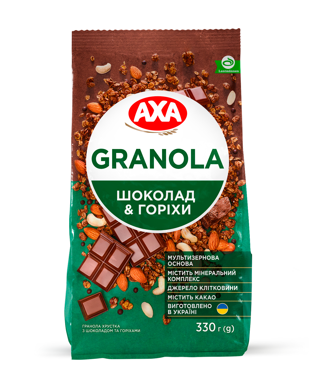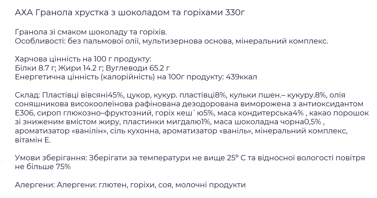 Хрустка та дуже смачна гранола з додаванням шоколаду та горіхів. Виготовлена на мультизерновій основі. Містить мінеральний комплекс.