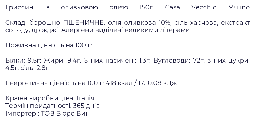 Грісіні Casa Vecchio Mulino з оливковою олією 150 г