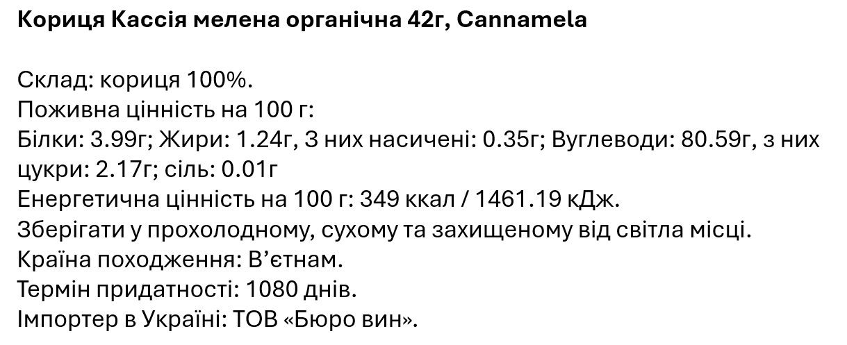 Мелена органічна кассія від італійського бренду Cannamela має теплий огортаючий аромат і виразний пряний смак, характерний для цього виду кориці. Спецію застосовують у випічці на кшталт штруделя або яблучних пирогів, десертах, морозиві, кремах, а також у соусах, джемах чи глінтвейні. На відміну від «справжньої» цейлонської кориці, кассія має більш «грубий» смак з помітною гірчинкою. Але в подрібненому вигляді ці види приправи майже не відрізняються, тому саме з кассією ми зазвичай стикаємось у покупній випічці.