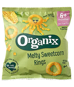 Кукурудзяні органічні снеки Кільця бренду Organix — це ідеальний перекус для дітей. Ці снеки смачні й корисні. Основний компонент — кукурудза, яка становить 78,0 % складу. Додатково використовується порошок цукрової кукурудзи, що додає натуральної солодкості й приємного смаку. Снеки мають повітряну текстуру.