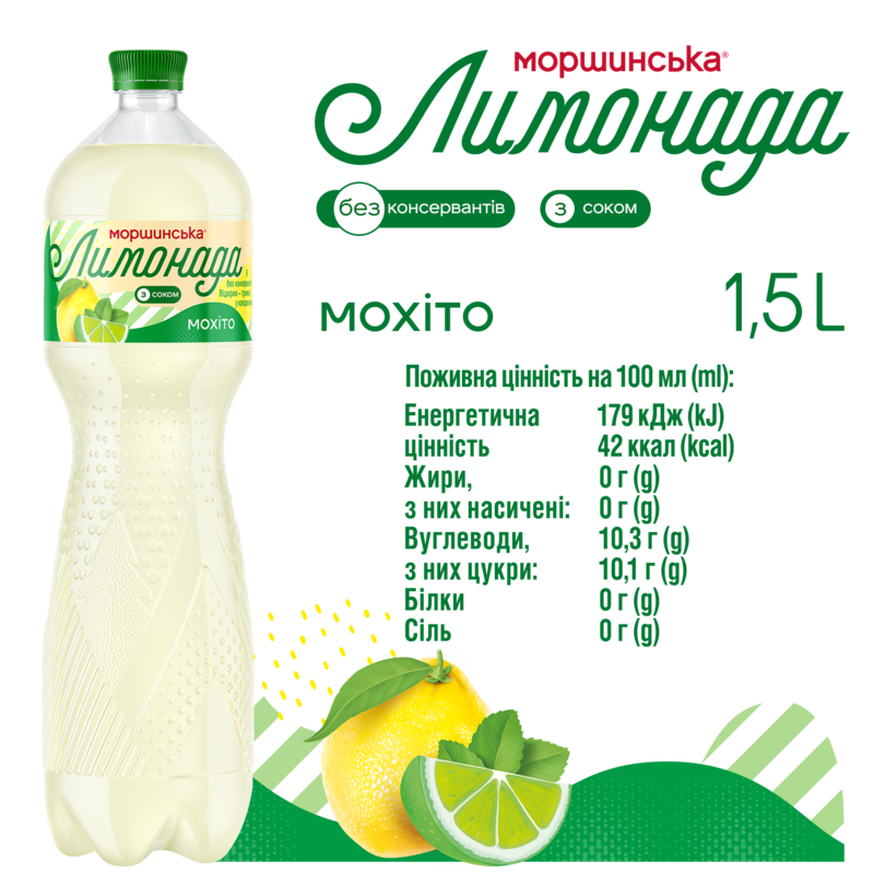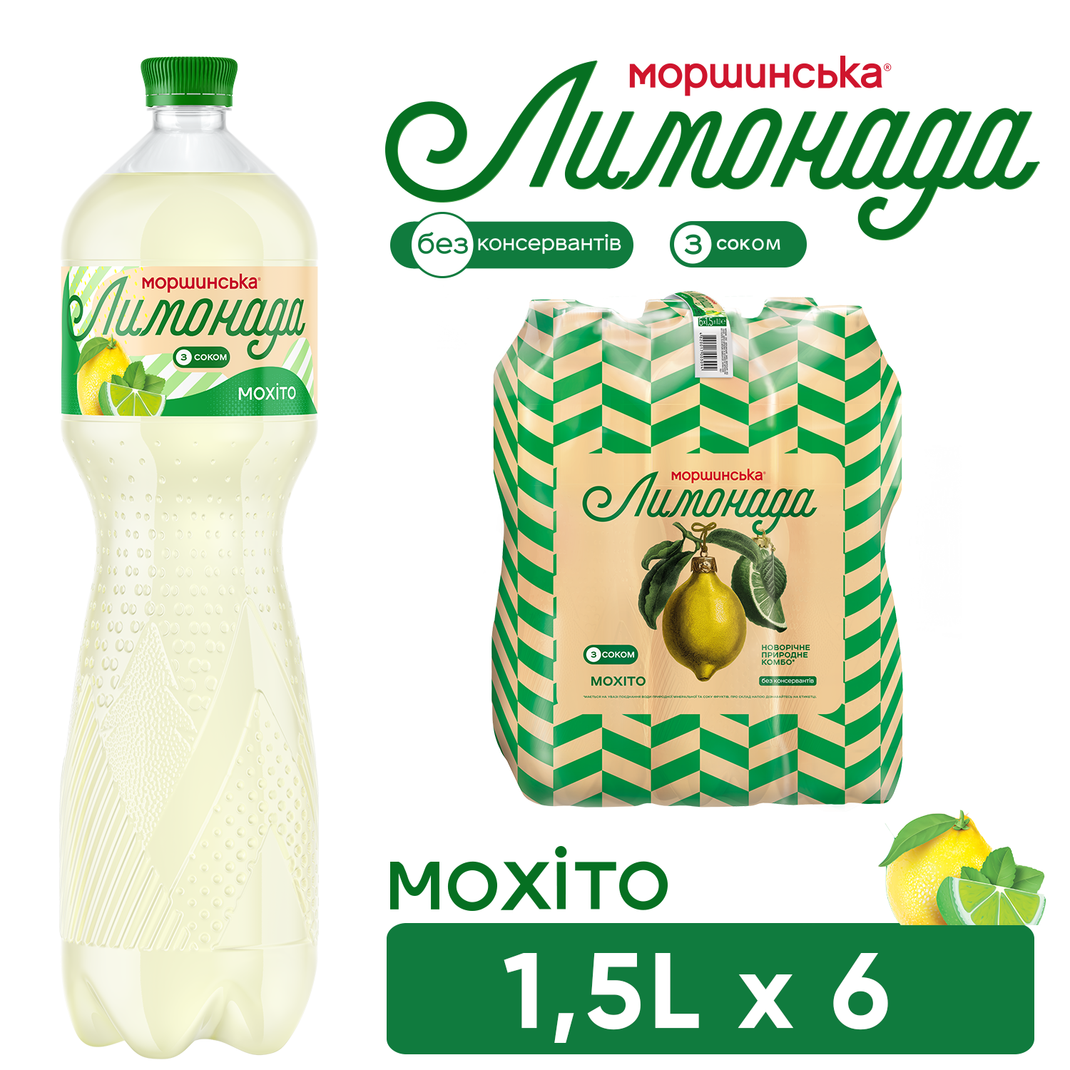 Сплеск освіжаючого фруктового смаку — комбо природної мінеральної води Моршинська та натуральних соків улюблених фруктів. Жодних консервантів, штучних барвників та ароматизаторів. Так, соковито, свіжо, мммм… Насолода! Лимонада Мохіто — новий рівень освіження, створений на основі природної мінеральної Моршинської та міксу натуральних соків лимона й лайма.