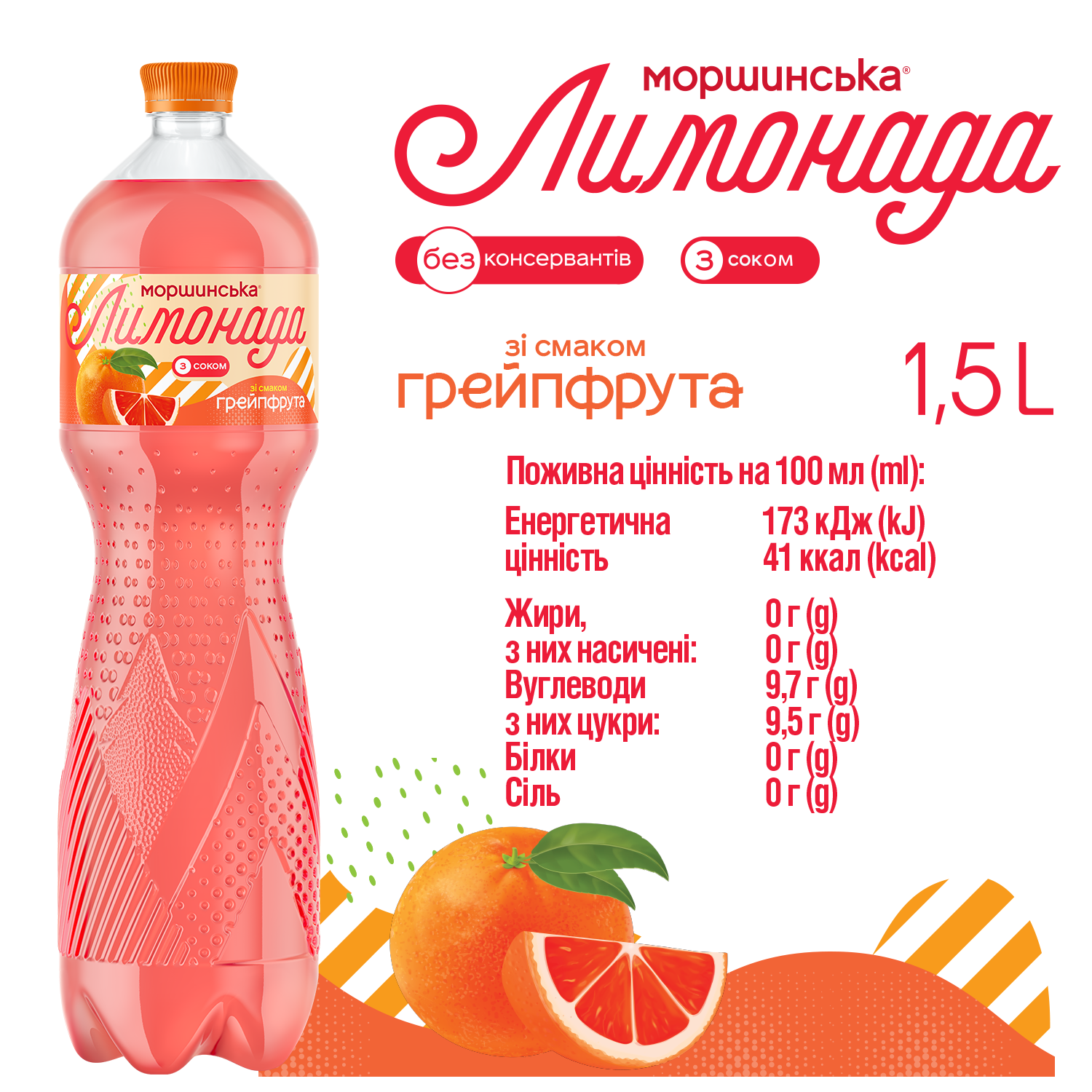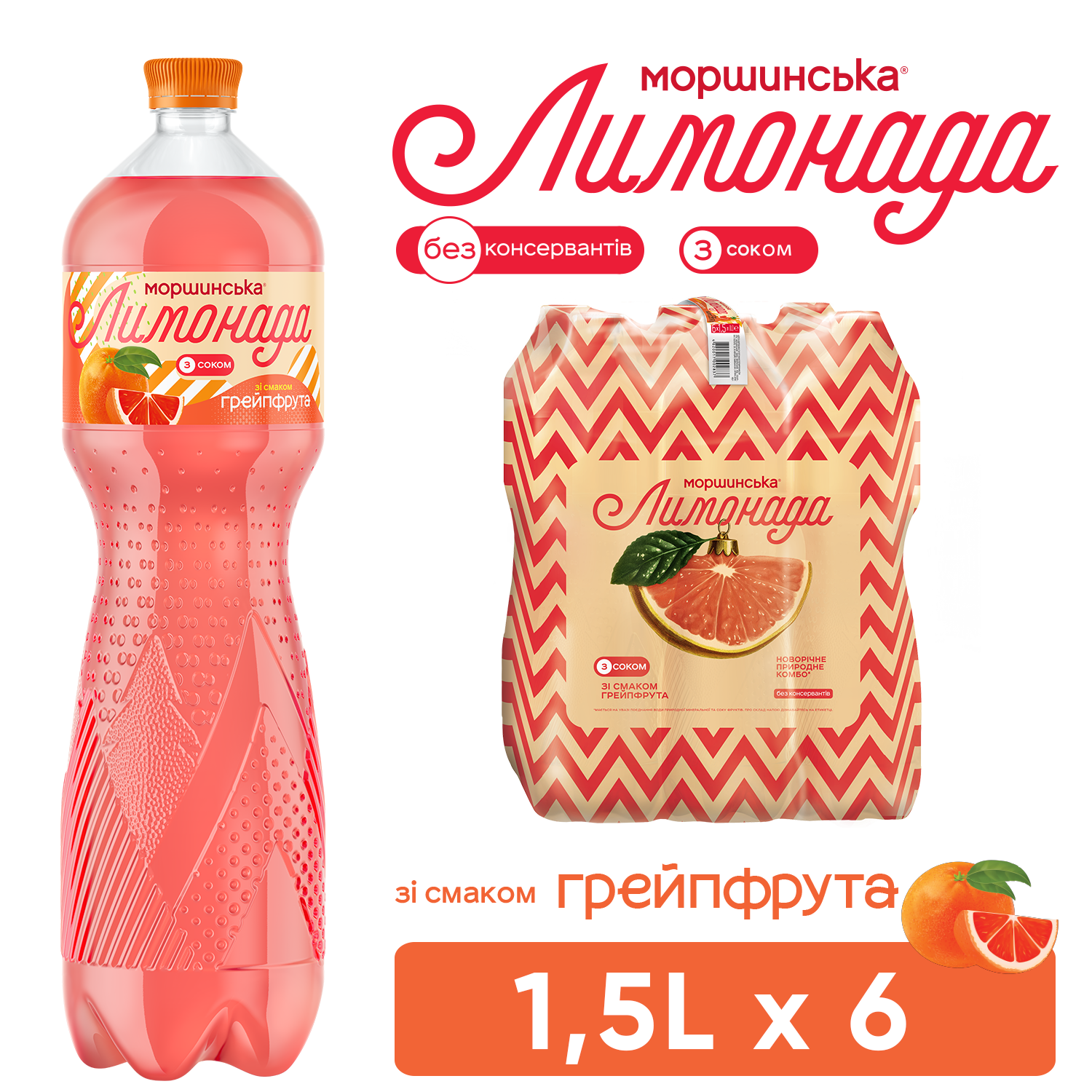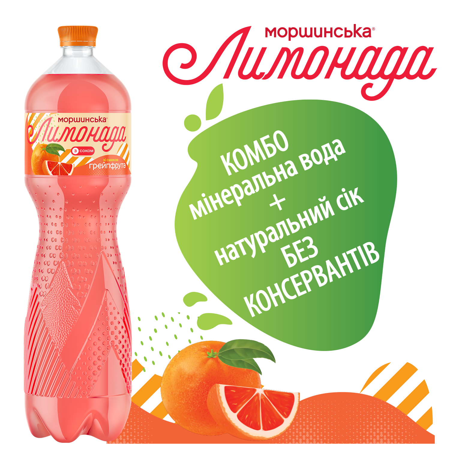 Сплеск освіжаючого фруктового смаку — комбо природної мінеральної води Моршинська та натуральних соків улюблених фруктів. Жодних консервантів, штучних барвників та ароматизаторів. Так, соковито, свіжо, мммм… Насолода! Лимонада зі смаком грейпфрута створена на основі природної мінеральної Моршинської з додаванням соку стиглого грейпфрута — для природного смаку з легкою цитрусовою кислинкою та ноткою свіжості.