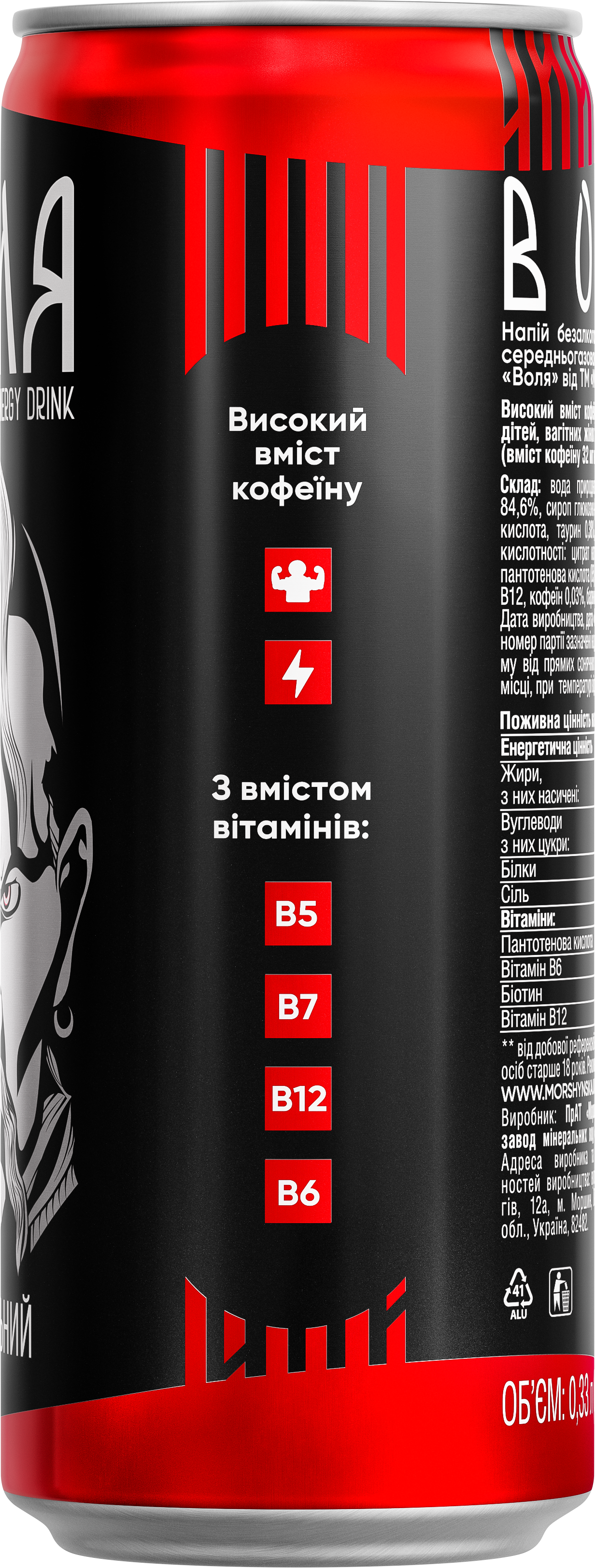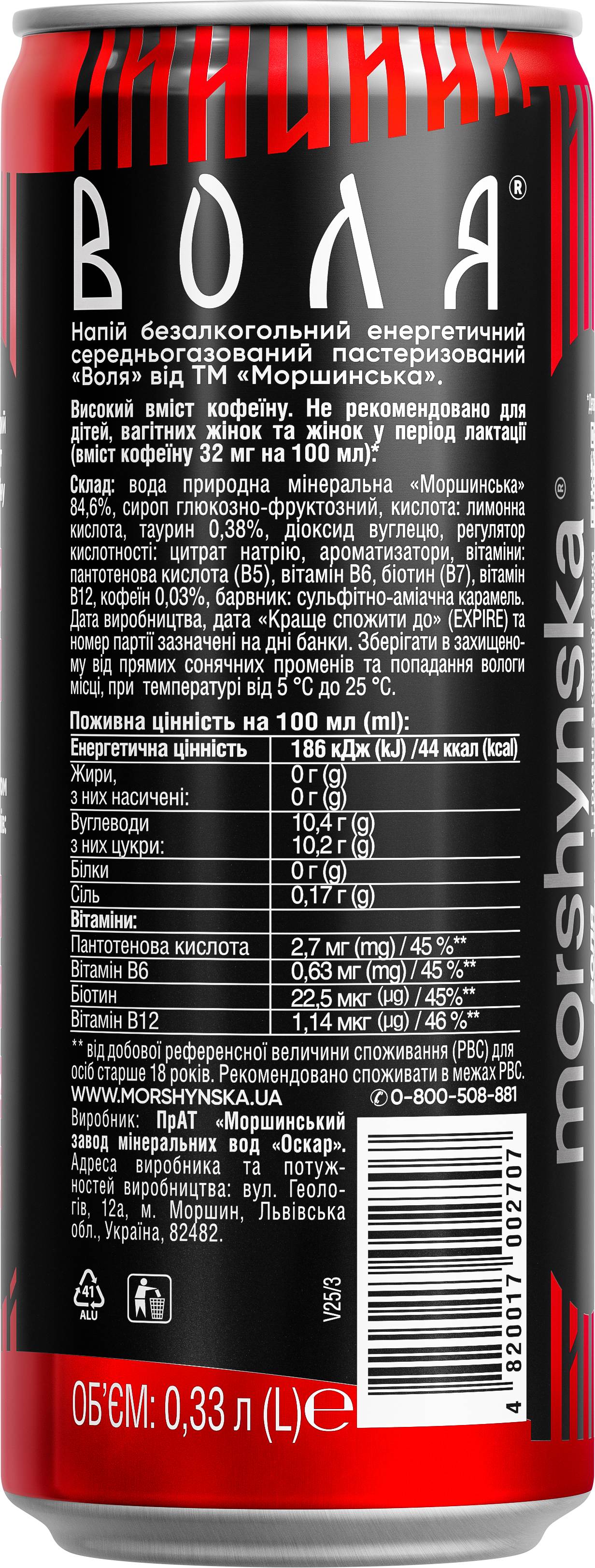 Енергетичний напій «Воля» від «Моршинська» оригінальний — перший український енергетичний напій на природній мінеральній воді з функціональними компонентами: кофеїн, вітаміни групи В (Пантотенова кислота (В5), В6, Біотин (В7), В12), таурин.