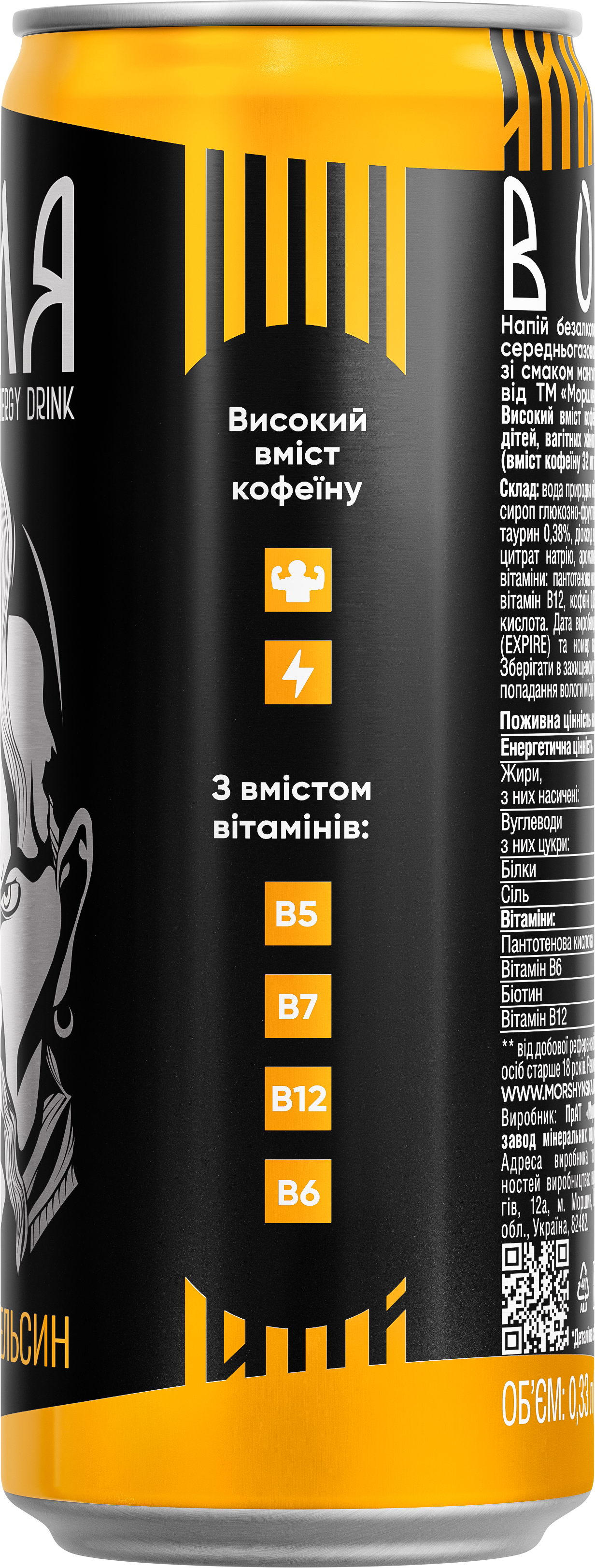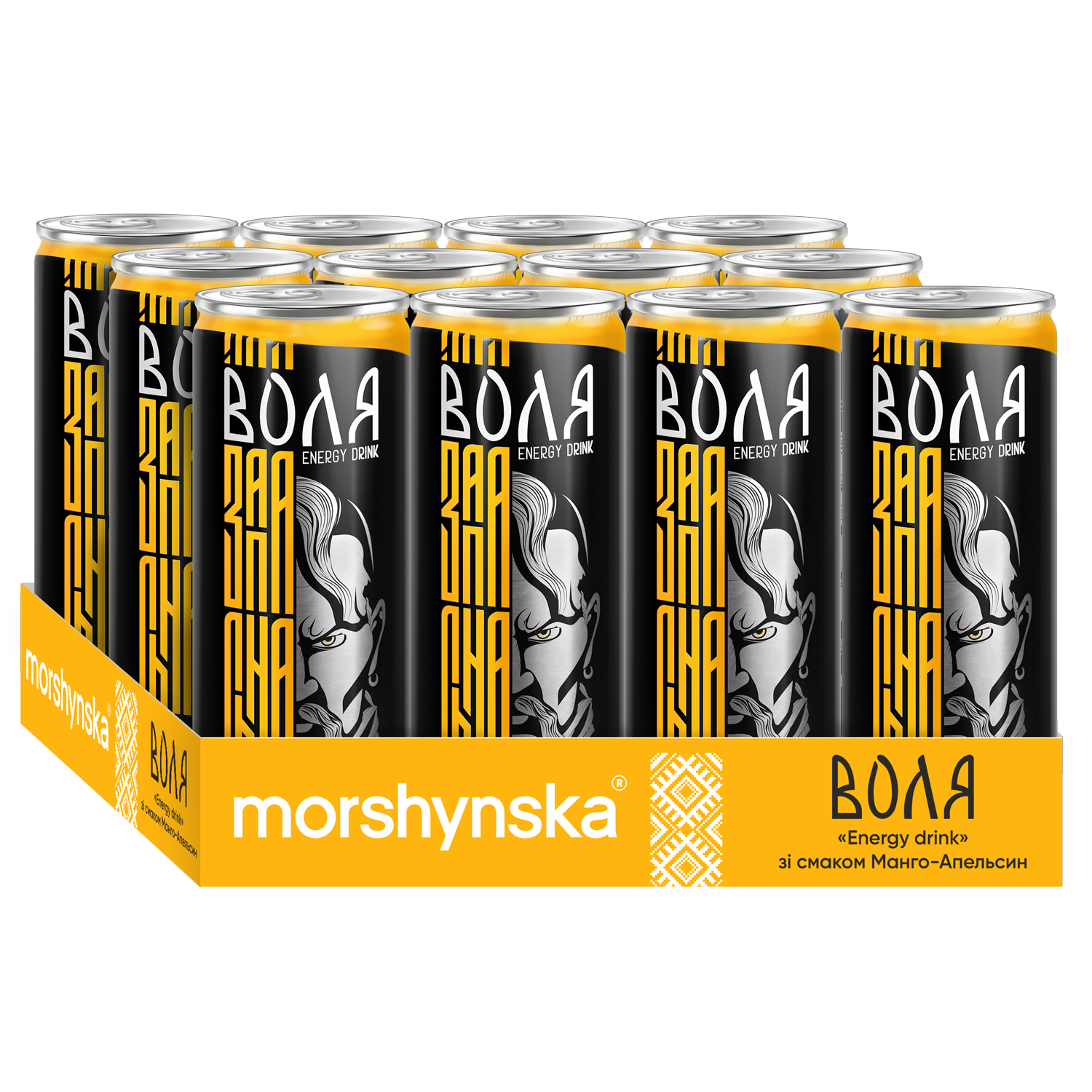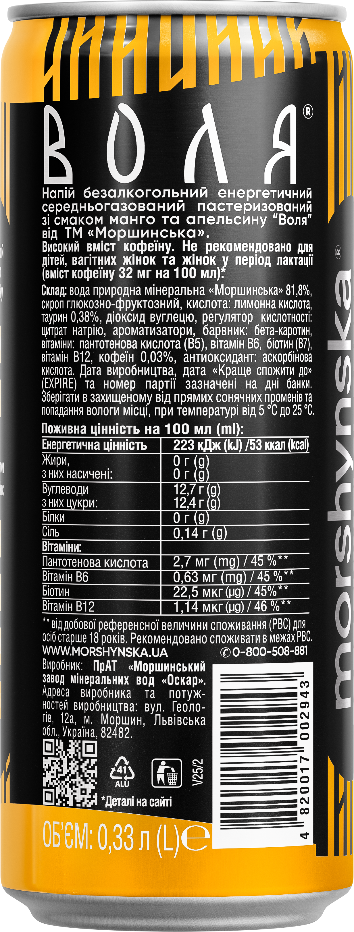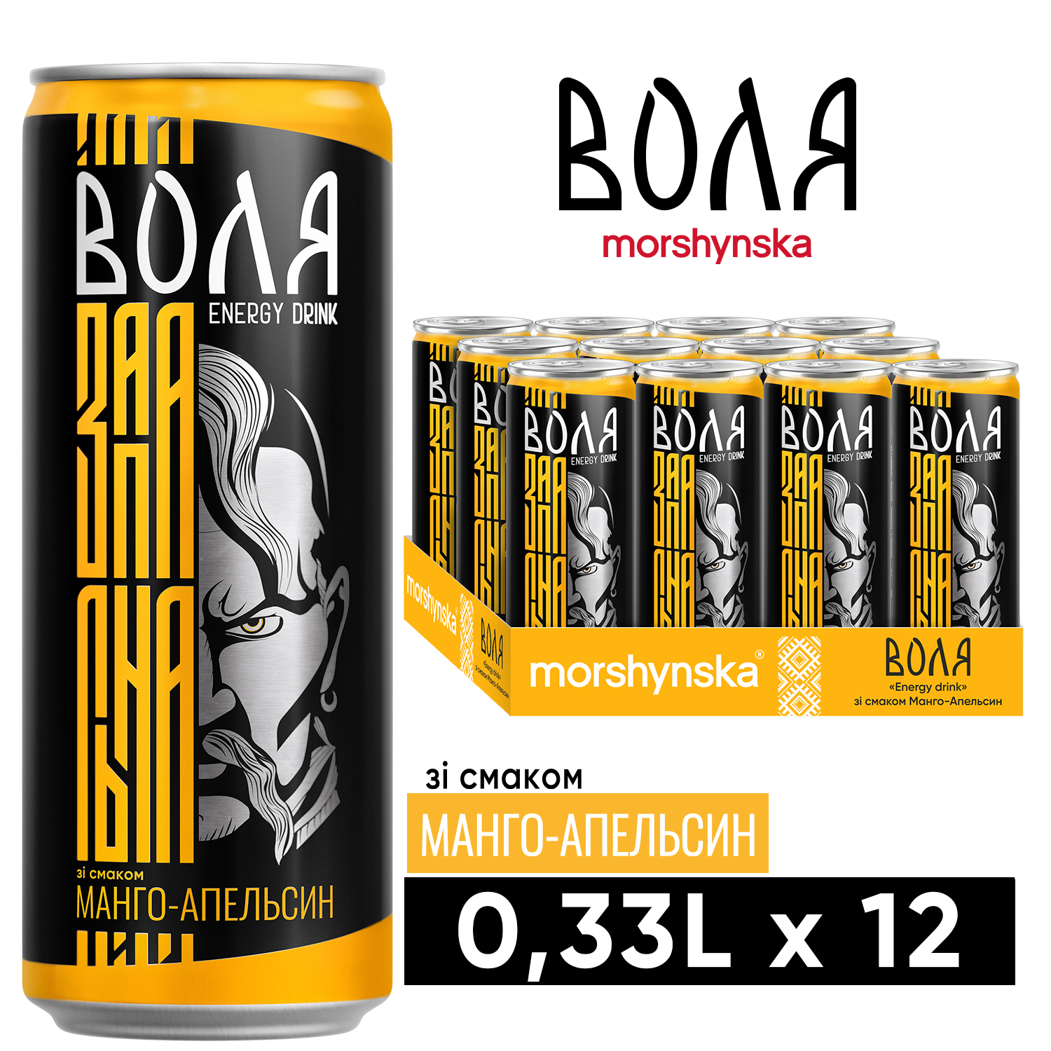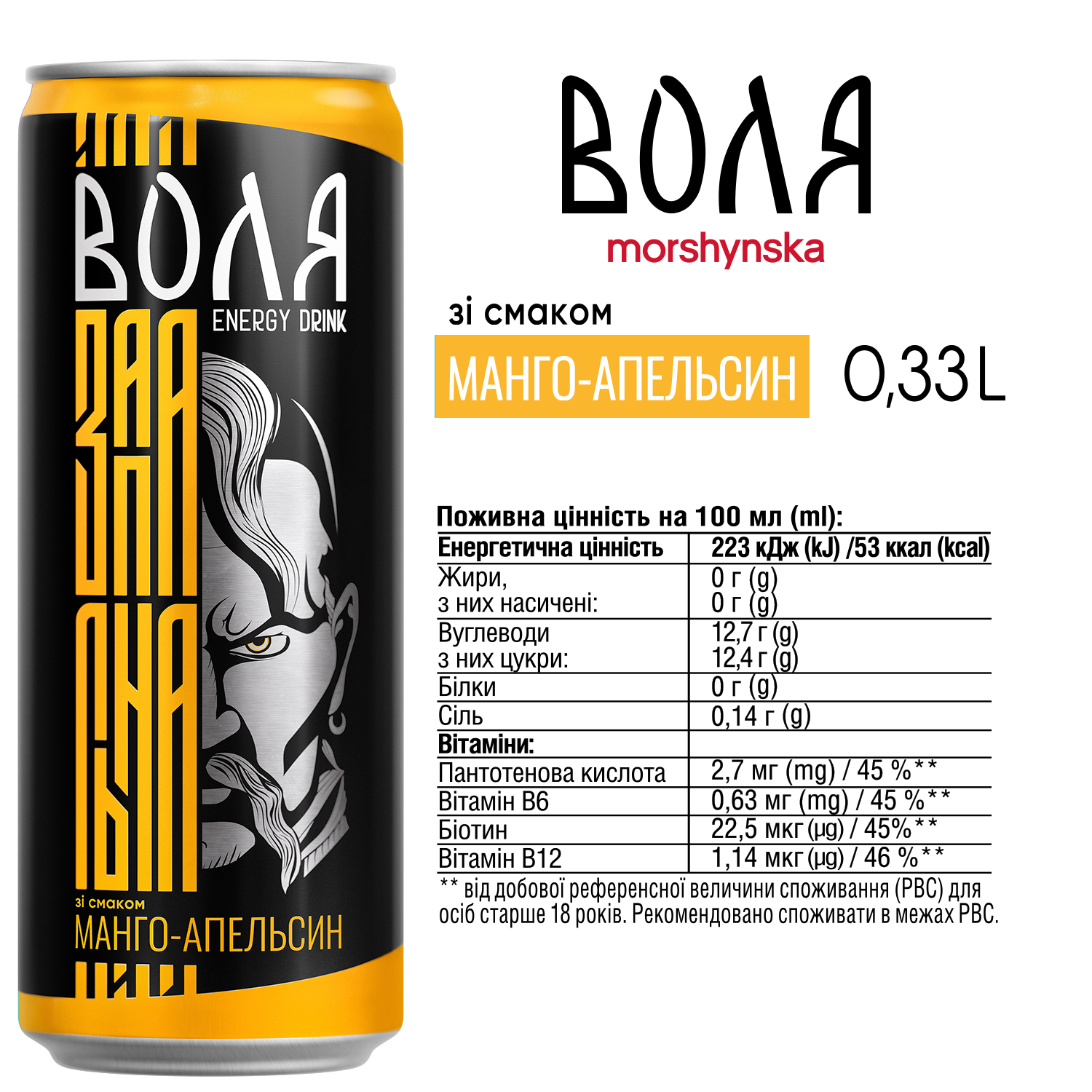 Енергетичний напій «Воля» від «Моршинська» зі смаком манго-апельсин — перший український енергетик на природній мінеральній воді з функціональними компонентами: кофеїн, вітаміни групи В (Пантотенова кислота (В5), В6, Біотин (В7), В12), таурин. Солодкий манго у поєднанні з цитрусовою ноткою апельсина — тропічний заряд енергії!