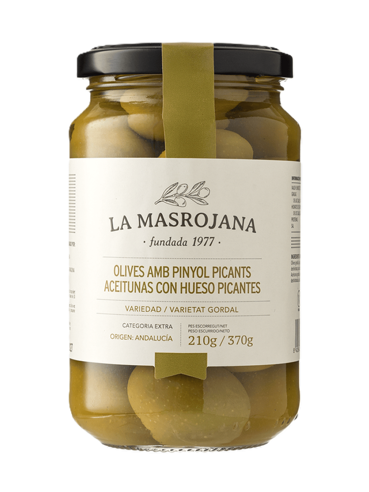 Гострі оливки з кісточкою Гордаль — стовідсотково веганський делікатес з Іспанії. Родинна компанія La Masrojana обробляє автентичні каталонські сорти оливок за рецептами, що передаються із покоління в покоління. Гастрономи та шеф-кухарі цінують оливки гордаль за великий розмір (gordal з іспанської — товстун), м'ясистість і ніжний аромат. Оливки, засолені із перцем чилі, помірно солоні й виразно гострі. Ці ніжно-зелені плоди — чудова закуска, низькокалорійний апетайзер, пікантне доповнення салатів, сирних і м'ясних асорті.