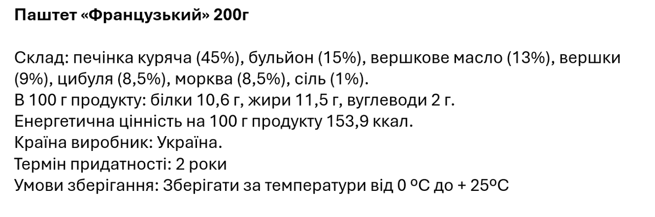 Візитна картка паштету — пасерована куряча печінка вищого ґатунку. Смакову композицію доповнює ароматний бульйон з добірної курятини. До складу додано щедру порцію пасерованої моркви та білої цибулі, щоб смак був ніжний і делікатний. Вершкове масло і вершки гарантують м’яке звучання всіх складових.