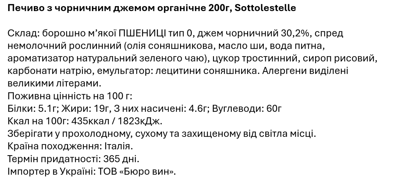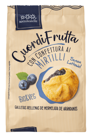 Печиво з чорничним джемом — вишуканий десерт. Ніжні й розсипчасті пісочні тістечка (фронліні) щедро наповнені густою ароматною начинкою. Італійська компанія Sottolestelle спеціалізується на веганському та здоровому печиві й хлібобулочних виробах. Вона ретельно розробляє рецептуру, щоб адаптувати національні кондитерські традиції до сучасних дієтичних вимог.