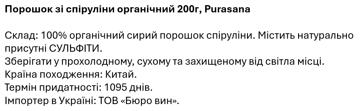 Порошок зі спіруліни Purasana — це натуральний продукт із водоростей, які вирощені у контрольованих умовах. Не містить глютену, лактози, штучних добавок. Порошок зі спіруліни Purasana продається вже готовим до споживання. Його можна додавати у воду, соки чи інші напої, використовувати як інгредієнт смузі та будь-яких страв.
