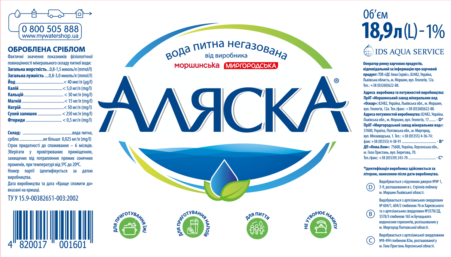 Аляска — кристально чистая вода, достигаемая благодаря комплексной очистке. Вода имеет низкий уровень минерализации, позволяющий потреблять ее каждый день. Серебряный призер международного конкурса Gourmet Waters в 2017 году. Объем бутыли — 18,9 л.