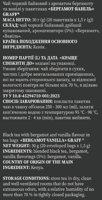 Это чай, воплощающий нежность и гармонию, приглашая Вас насладиться уникальной симфонией вкусов. Он сочетает свежесть и цитрусовые ноты бергамота с тёплым, бархатистым ароматом ванили, создавая чай, который идеально подходит как для особенных моментов, так и для повседневного отдыха.