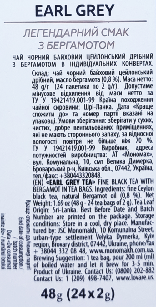 Пакетированный черный цейлонский чай с маслом бергамота.