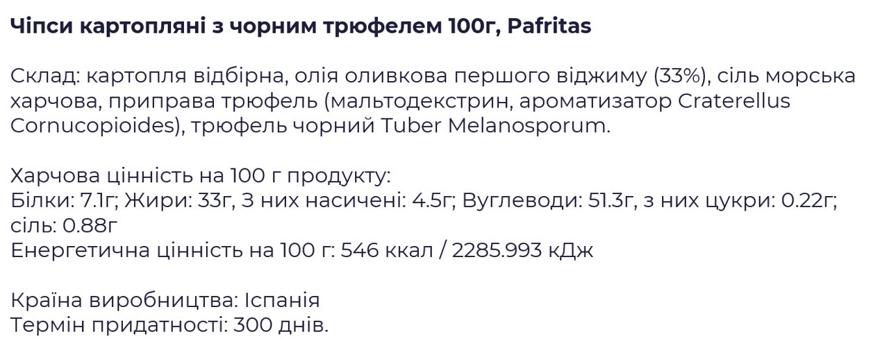 Картофельные чипсы с черным трюфелем Pafritas — идеальный вариант для перекуса. Картофель тонко нарезан и обжарен до идеальной хрусткости, а черный трюфель придает снекам роскошный землистый аромат. Вкус Pafritas глубокий и многогранный: классический картофельный с изысканными трюфельными нотками. Чипсы с черным трюфелем прекрасно подходят для романтического вечера с бокалом белого вина или просто, когда хочется побаловать себя. Испанский производитель отлично разбирается в создании утонченных закусок, сочетая традиционные методы приготовления чипсов с использованием лучших ингредиентов.