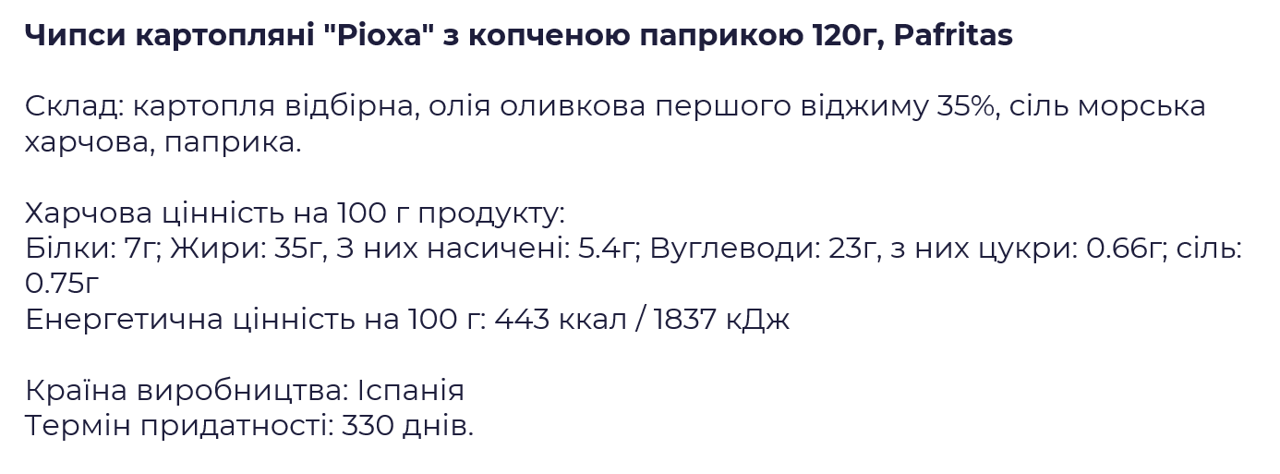 Чипсы картофельные бренда Pafritas понравятся любителям пикантных снеков. Паприка придает продукту копченые нотки и легкую остроту. Снек хрустящий, с пряным ароматом. В составе чипсов — картофель, оливковое масло, специи. «Риоха» — идеальный перекус, который можно взять в дорогу или на пикник. Испанский бренд Pafritas известен картофельными чипсами с оригинальными вкусами. Компания была основана тремя братьями и работает с 1994 года.
