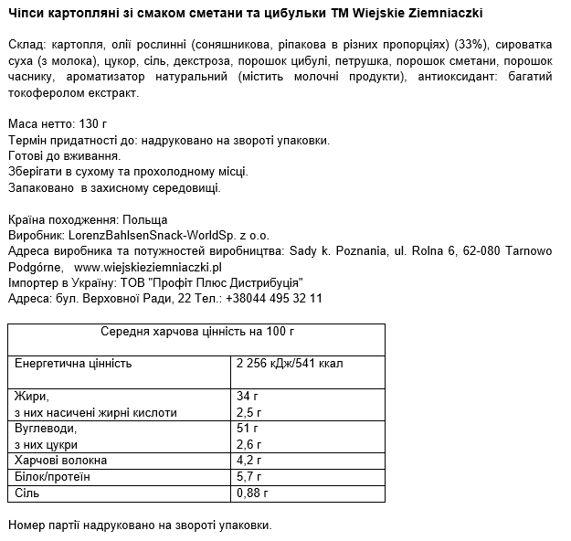 Хрустящие, вкусные чипсы Wiejskie Ziemniaczki — в польских традициях. Сочетание ароматных специй и ингредиентов позволяет понять, почему снеки Wiejskie Ziemniaczki исчезают мгновенно. Достаточно попробовать Wiejskie Ziemniaczki, чтобы вспомнить вкус свежего масла с солью, сочного копчения или зелёного лука, собранного прямо с бабушкиного огорода.
