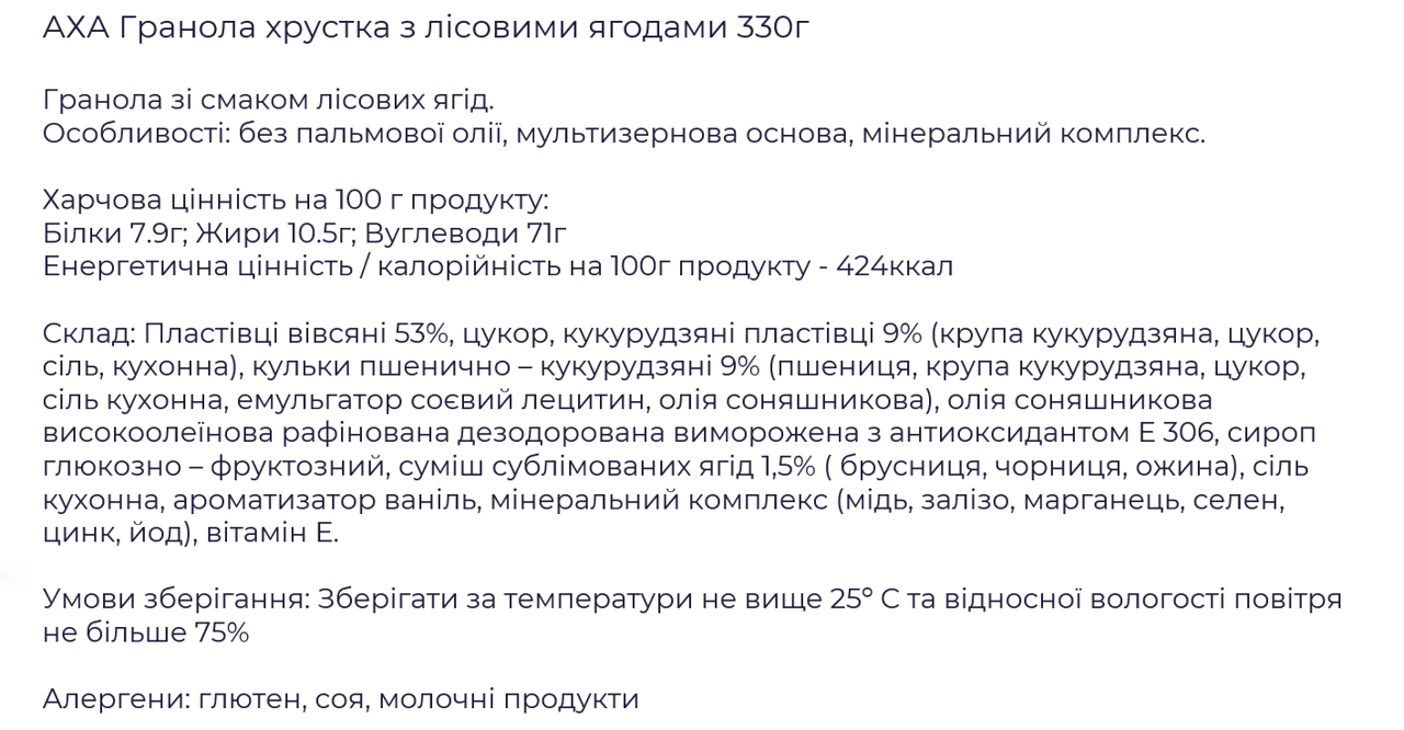 Хрустящая и очень вкусная гранола с добавлением лесных ягод. Изготовлена на мультизерновой основе, без пальмового масла. Содержит минеральный комплекс.