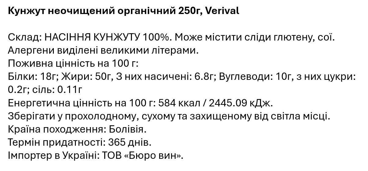Кунжут Verival станет полезным дополнением к любым кулинарным шедеврам. Благодаря этим семенам мясные, рыбные, овощные блюда, салаты, каши и выпечка приобретают новые вкусы и текстуру. Отсутствие обработки позволяет максимально сохранить все полезные свойства семян и содержащуюся в них клетчатку.