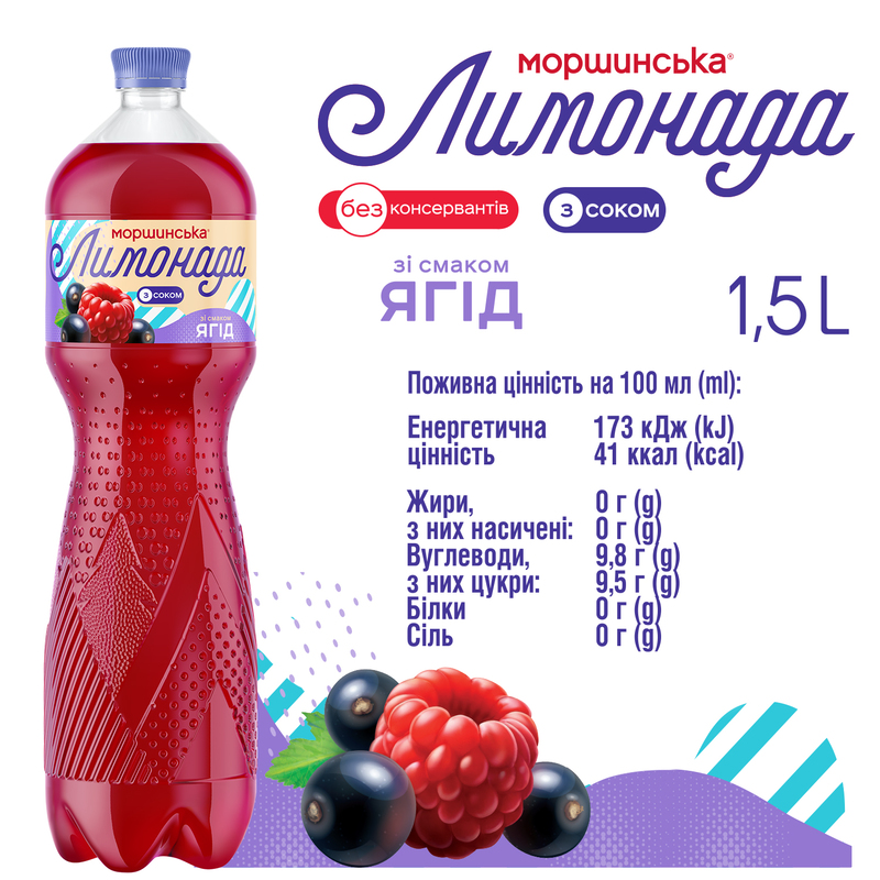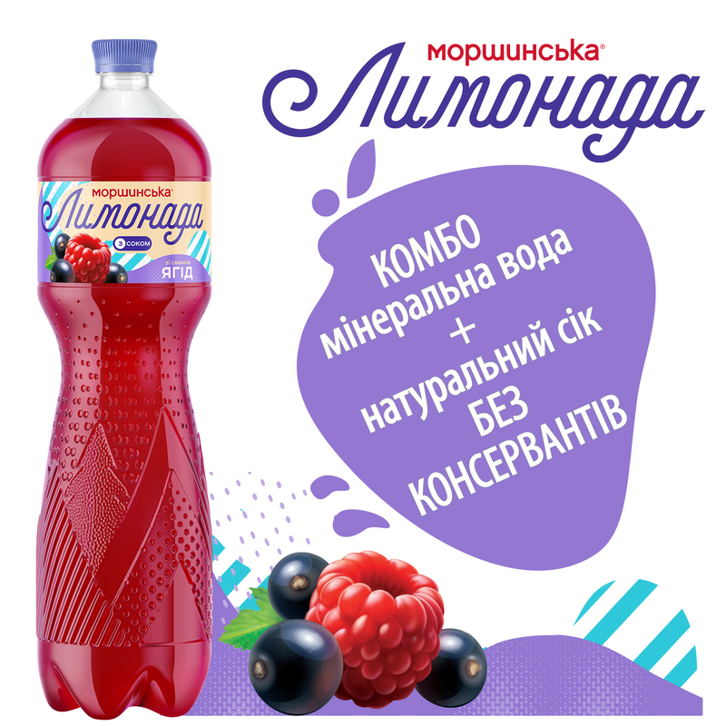Всплеск освежающего фруктового вкуса — это комбо природной минеральной воды Моршинская и натуральных соков любимых фруктов. Никаких консервантов, искусственных красителей и ароматизаторов. Так сочно, свежо, мммм… Наслаждение! Ягодная Лимонада сочетает сладкую малину с чёрной и красной смородиной — настоящий вихрь фруктово-ягодного вкуса и природного освежения.