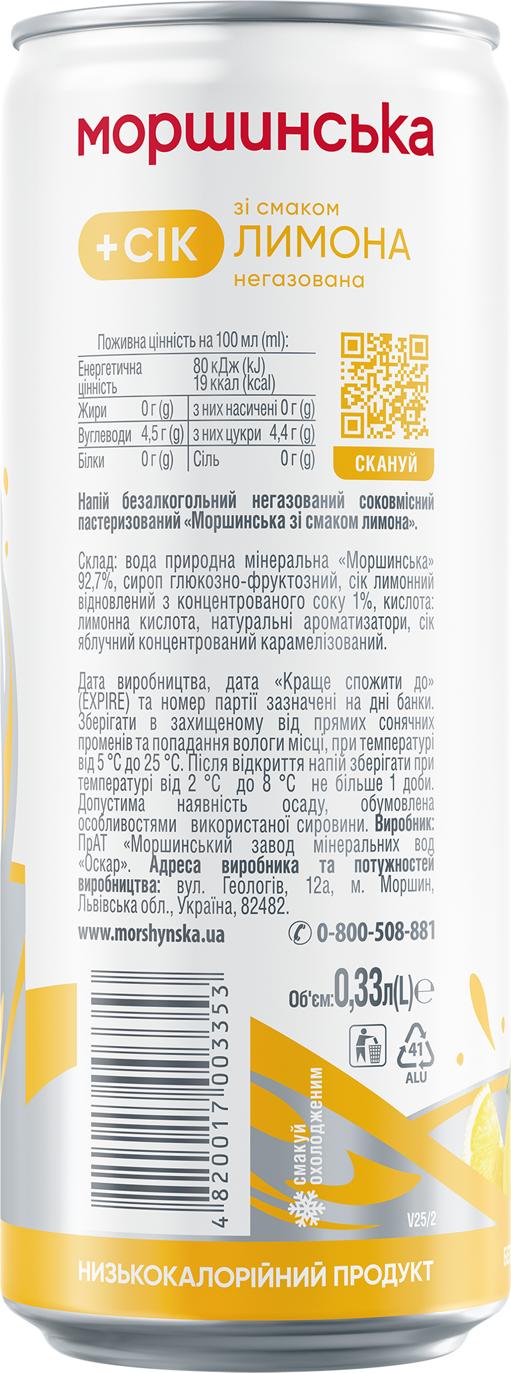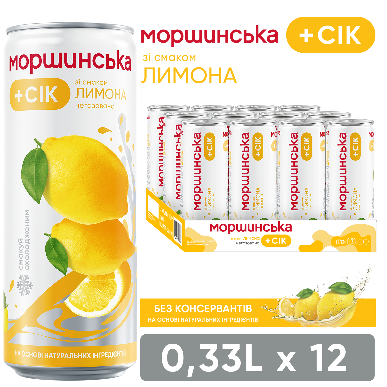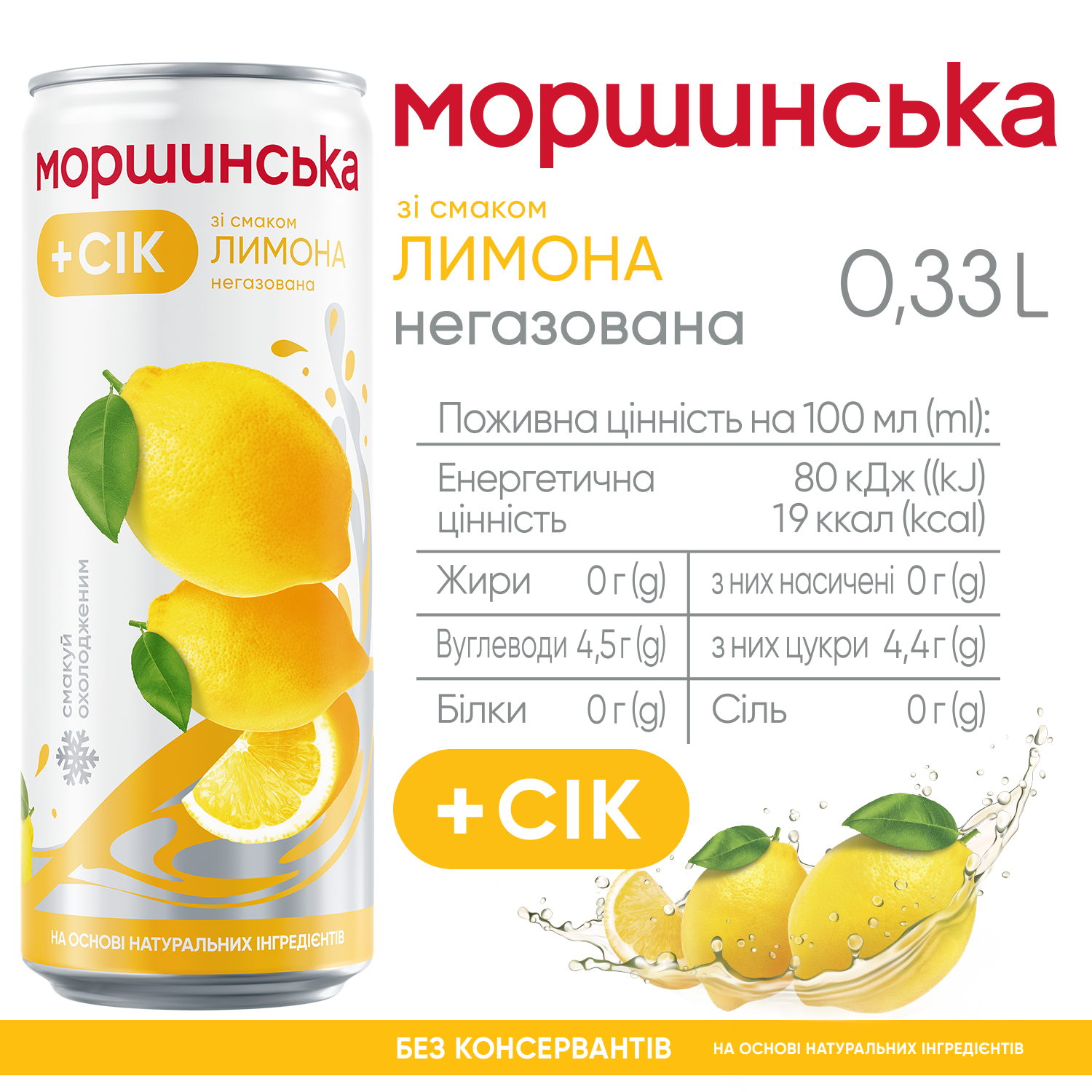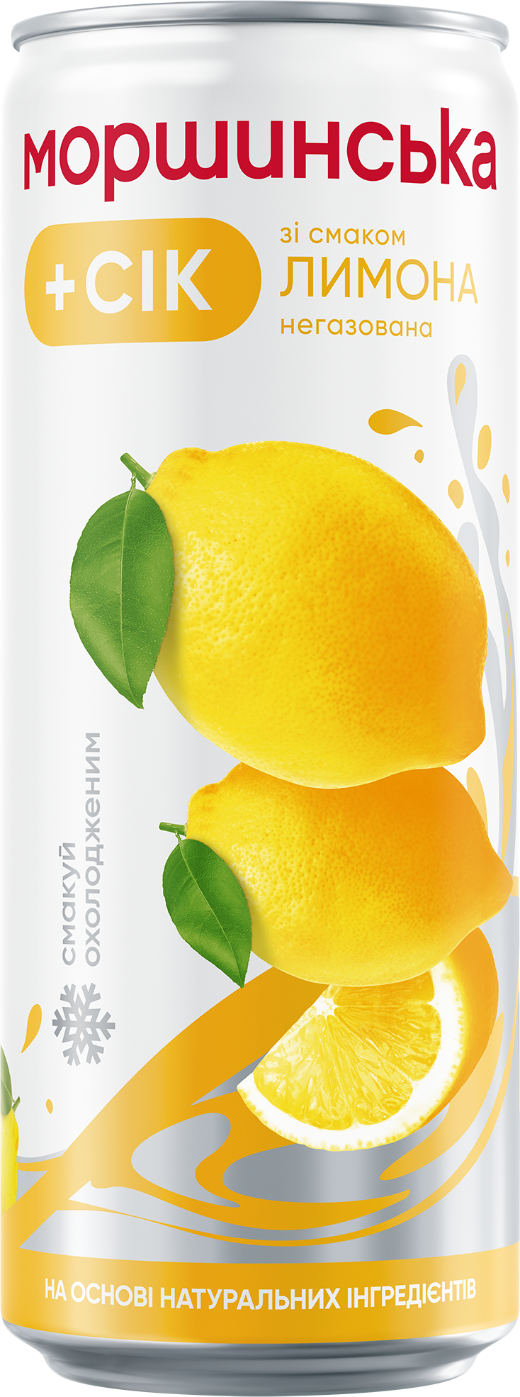 «Моршинская» со вкусом лимона — это сочетание природной минеральной воды «Моршинская» и натурального сока, которое дарит два в одном — и освежение, и удовольствие от вкуса. Содержит сок, без консервантов. На основе натуральных ингредиентов.