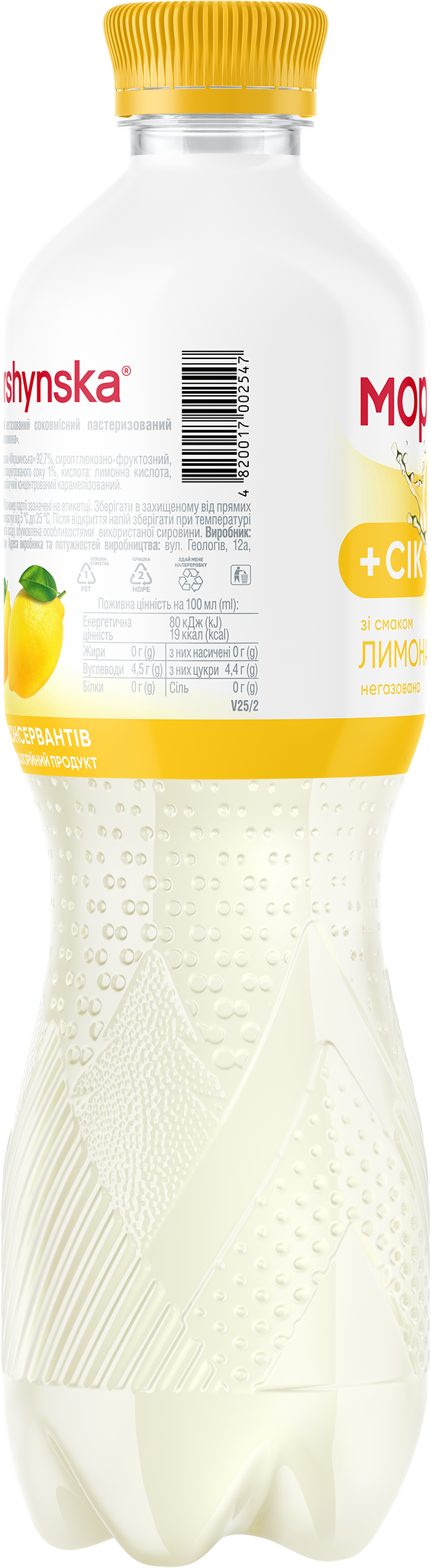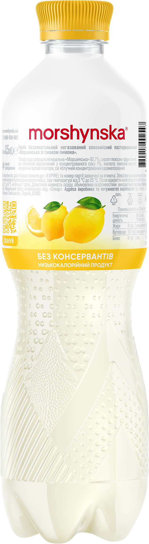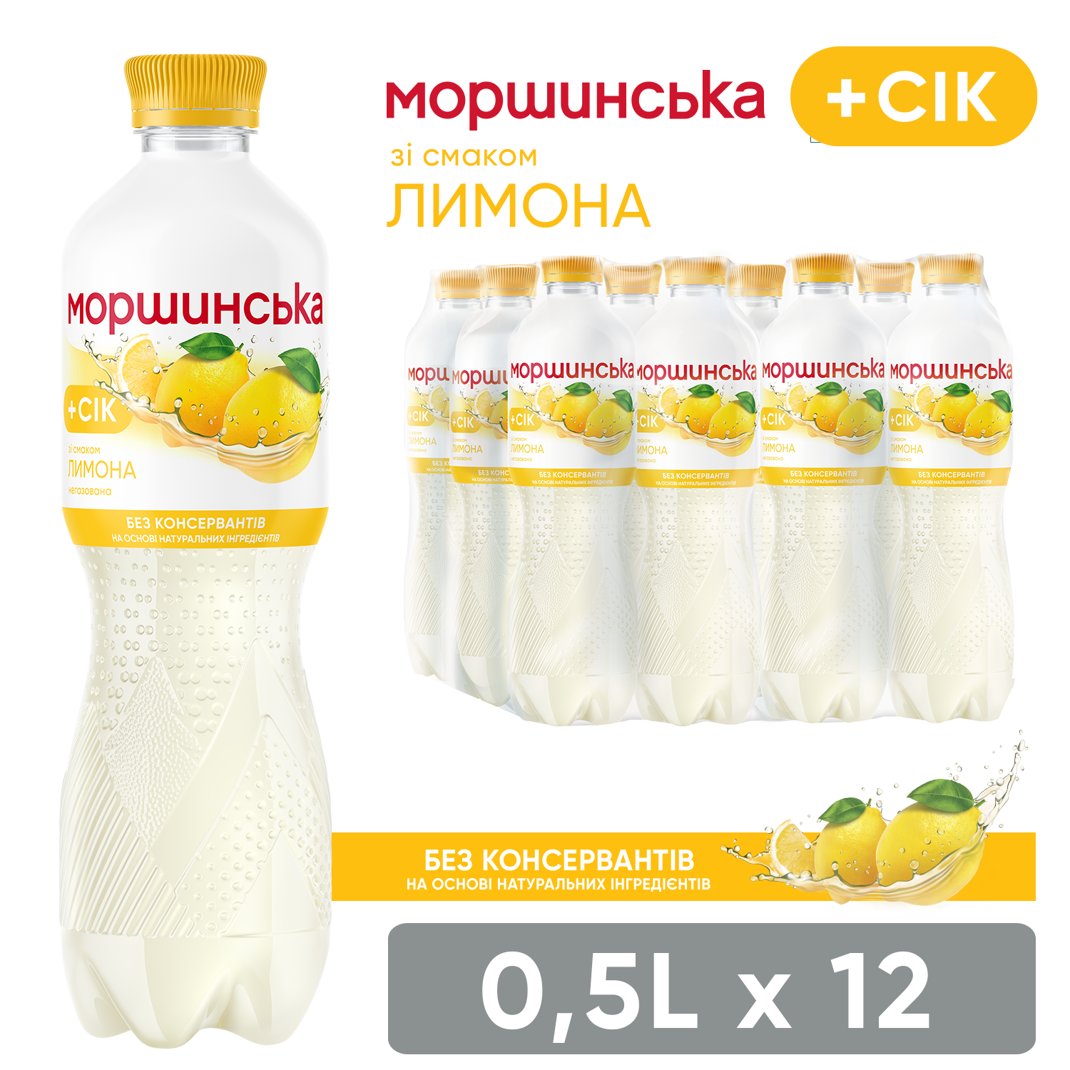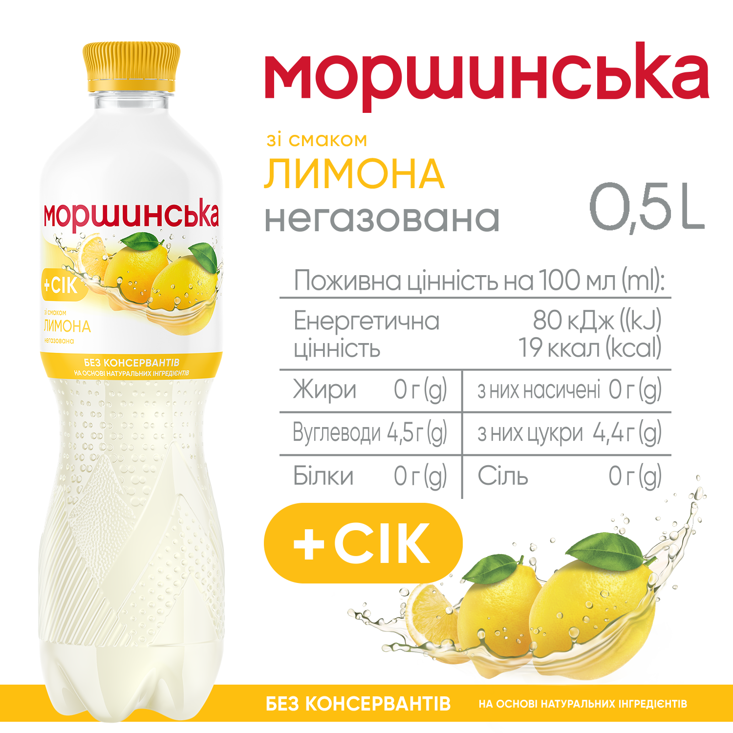 «Моршинская» со вкусом лимона — это сочетание природной минеральной воды «Моршинская» и натурального сока, которое дарит два в одном — и освежение, и удовольствие от вкуса. Содержит сок, без консервантов. На основе натуральных ингредиентов.