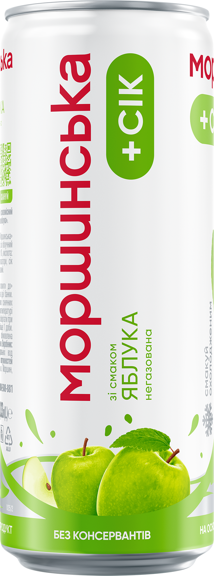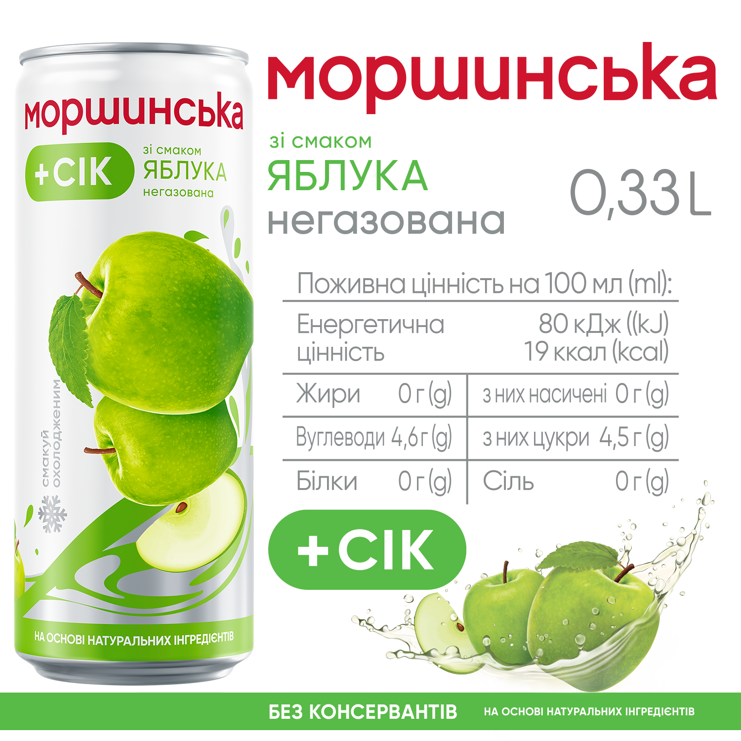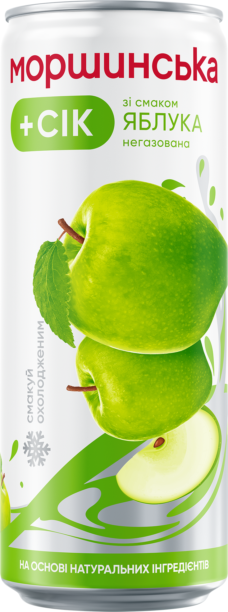«Моршинская» со вкусом яблока — это сочетание природной минеральной воды «Моршинская» и натурального сока, которое дарит два в одном — и освежение, и удовольствие от вкуса. Содержит сок, без консервантов. На основе натуральных ингредиентов.