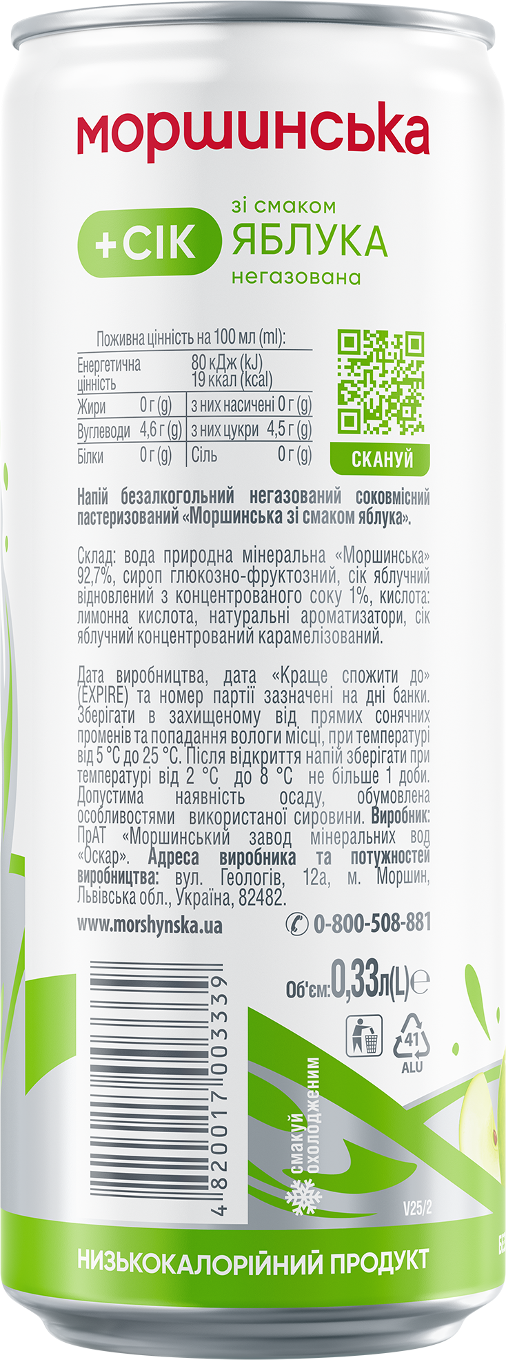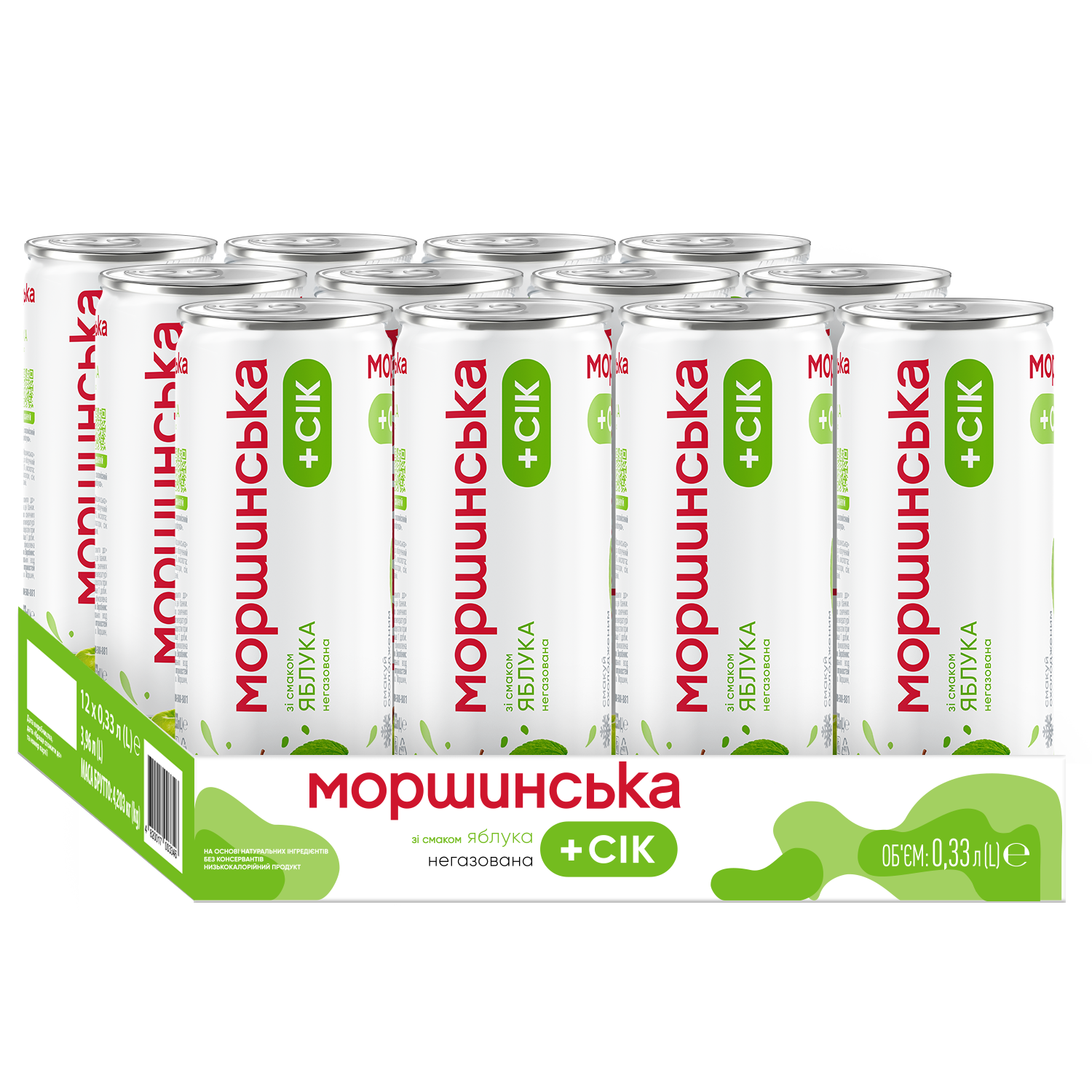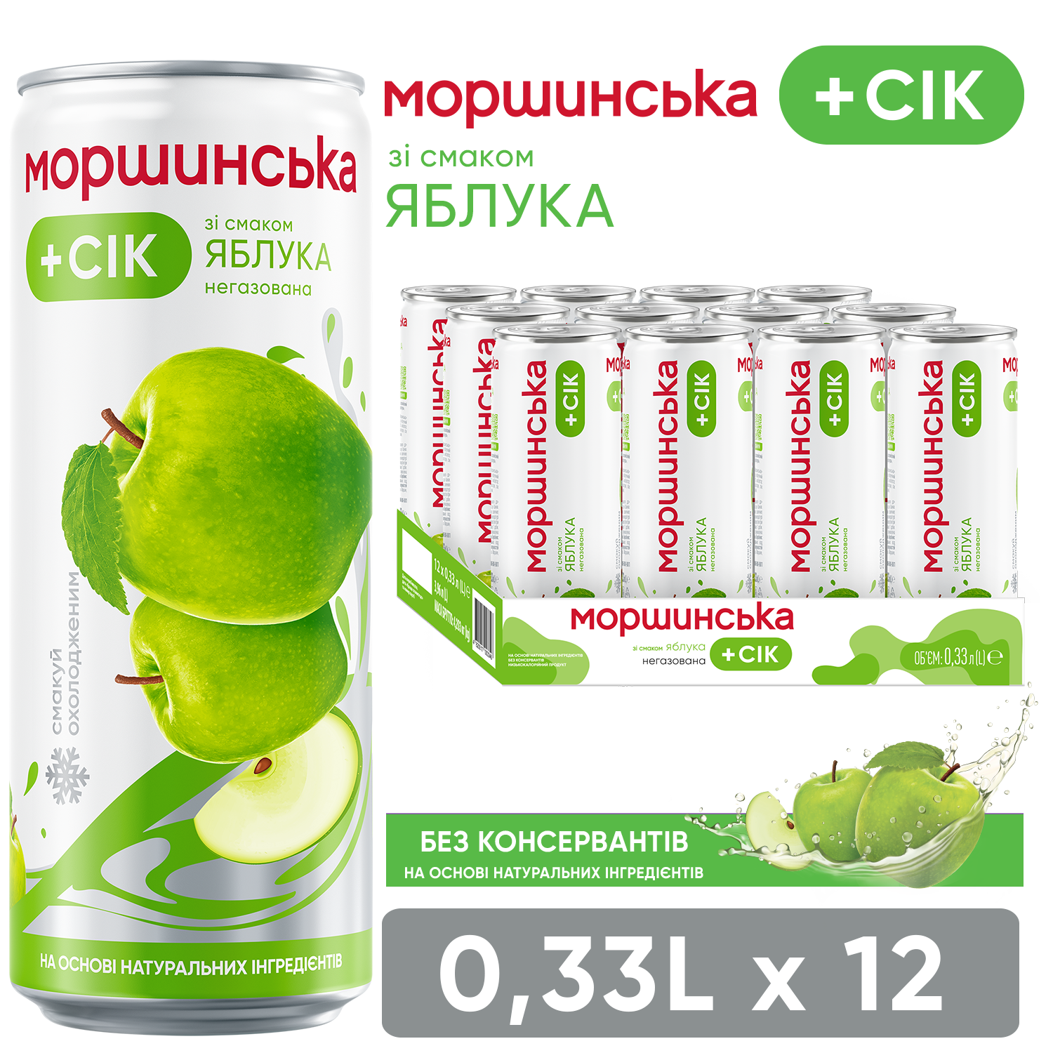 «Моршинская» со вкусом яблока — это сочетание природной минеральной воды «Моршинская» и натурального сока, которое дарит два в одном — и освежение, и удовольствие от вкуса. Содержит сок, без консервантов. На основе натуральных ингредиентов.