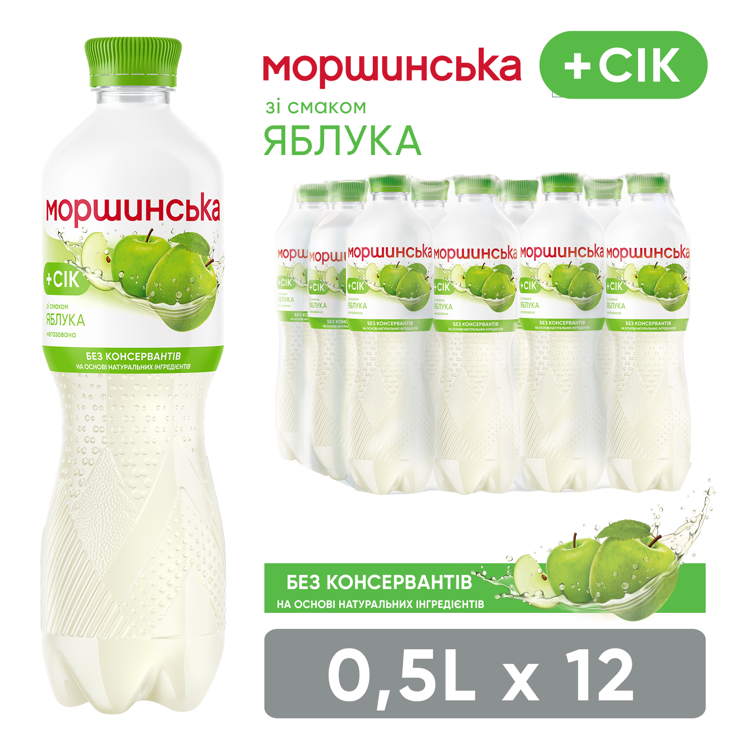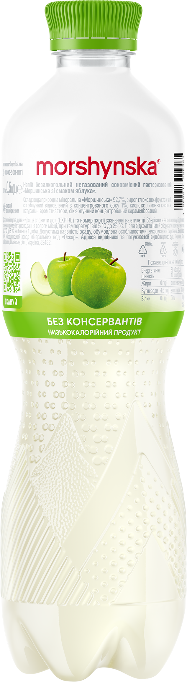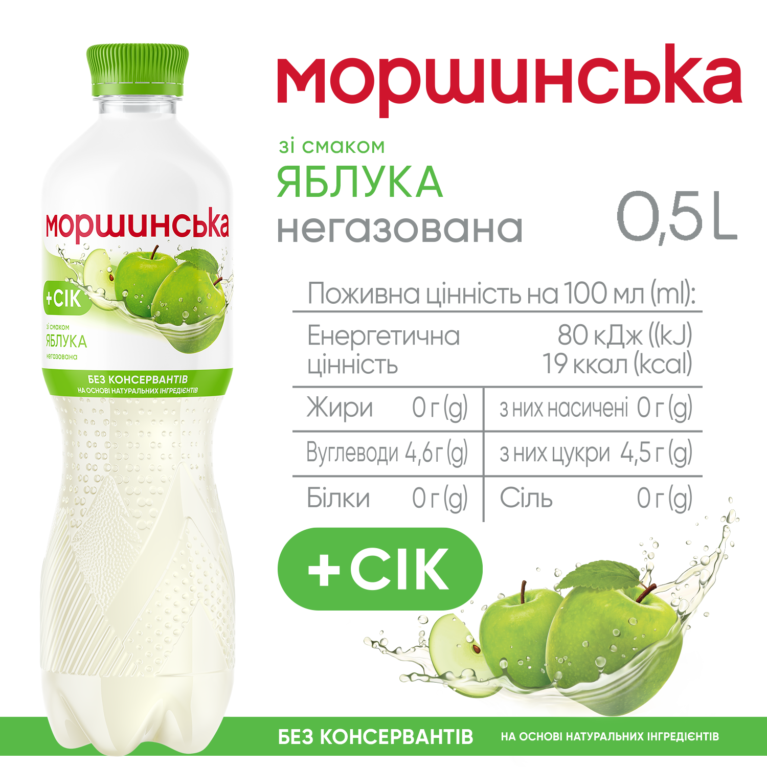 «Моршинская» со вкусом яблока — это сочетание природной минеральной воды «Моршинская» и натурального сока, которое дарит два в одном — и освежение, и удовольствие от вкуса. Содержит сок, без консервантов. На основе натуральных ингредиентов.