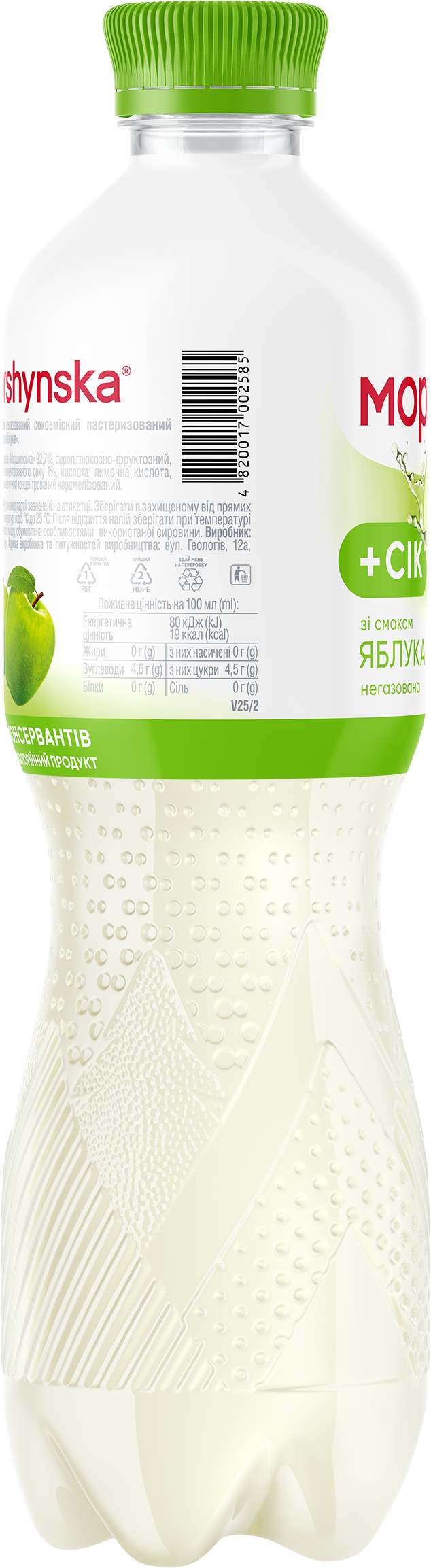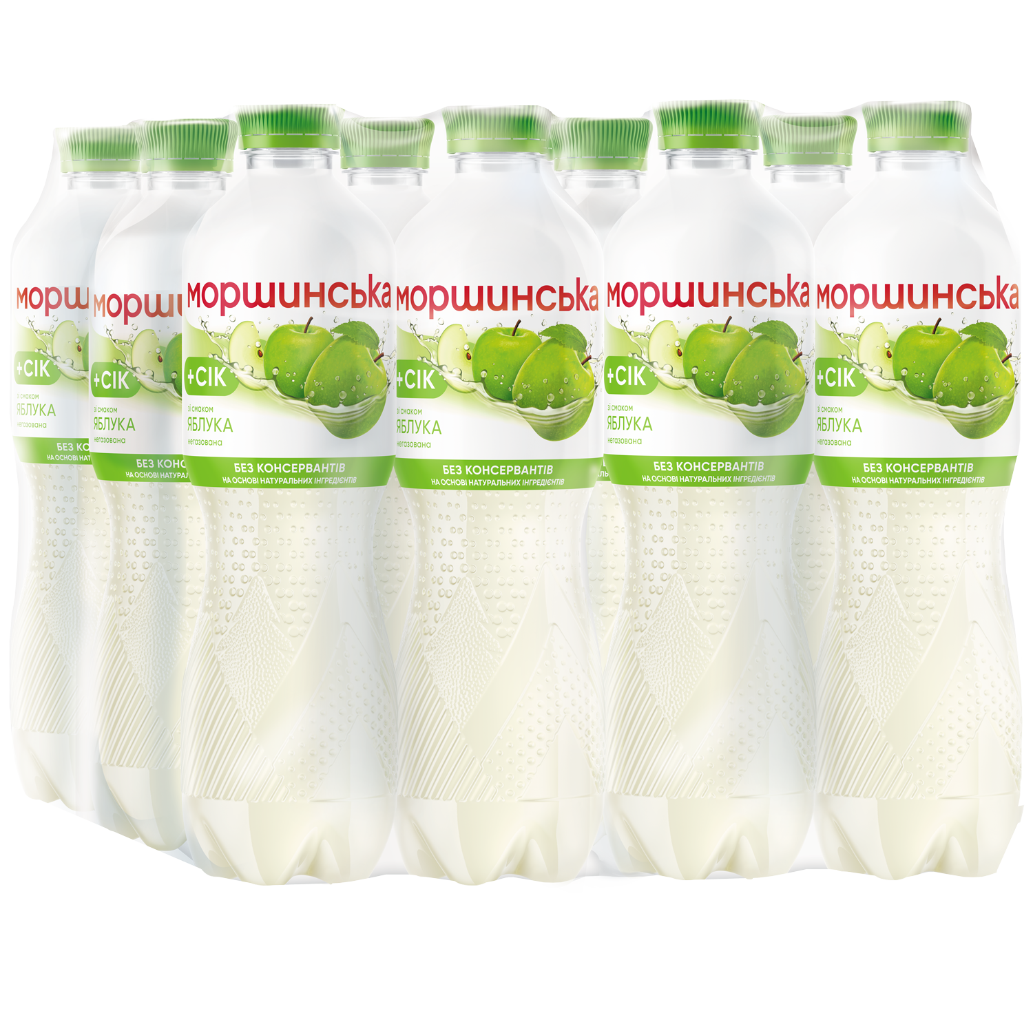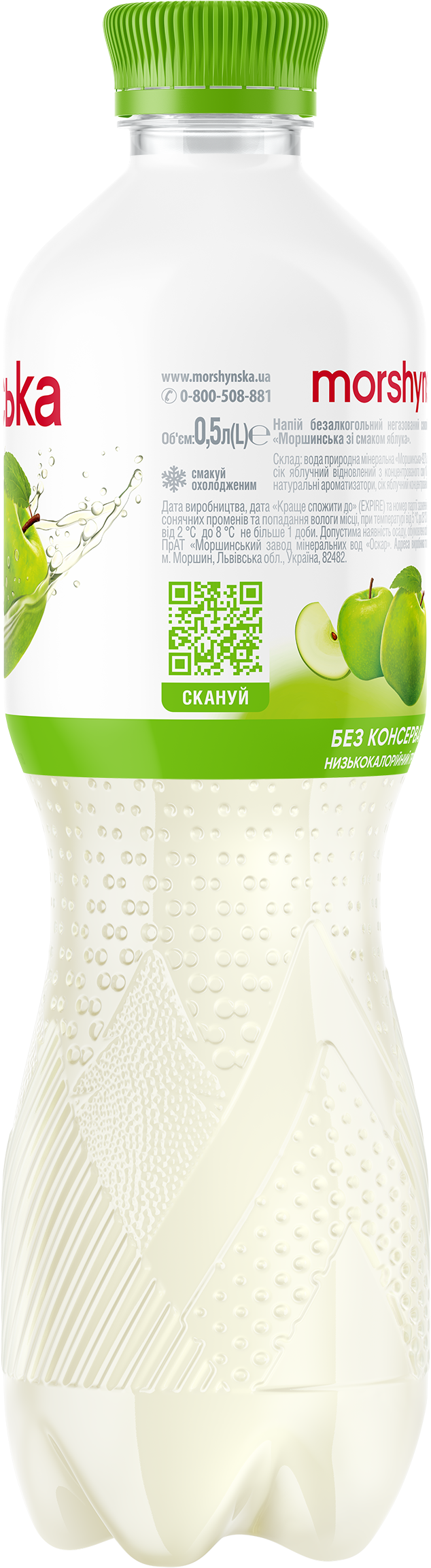 «Моршинская» со вкусом яблока — это сочетание природной минеральной воды «Моршинская» и натурального сока, которое дарит два в одном — и освежение, и удовольствие от вкуса. Содержит сок, без консервантов. На основе натуральных ингредиентов.