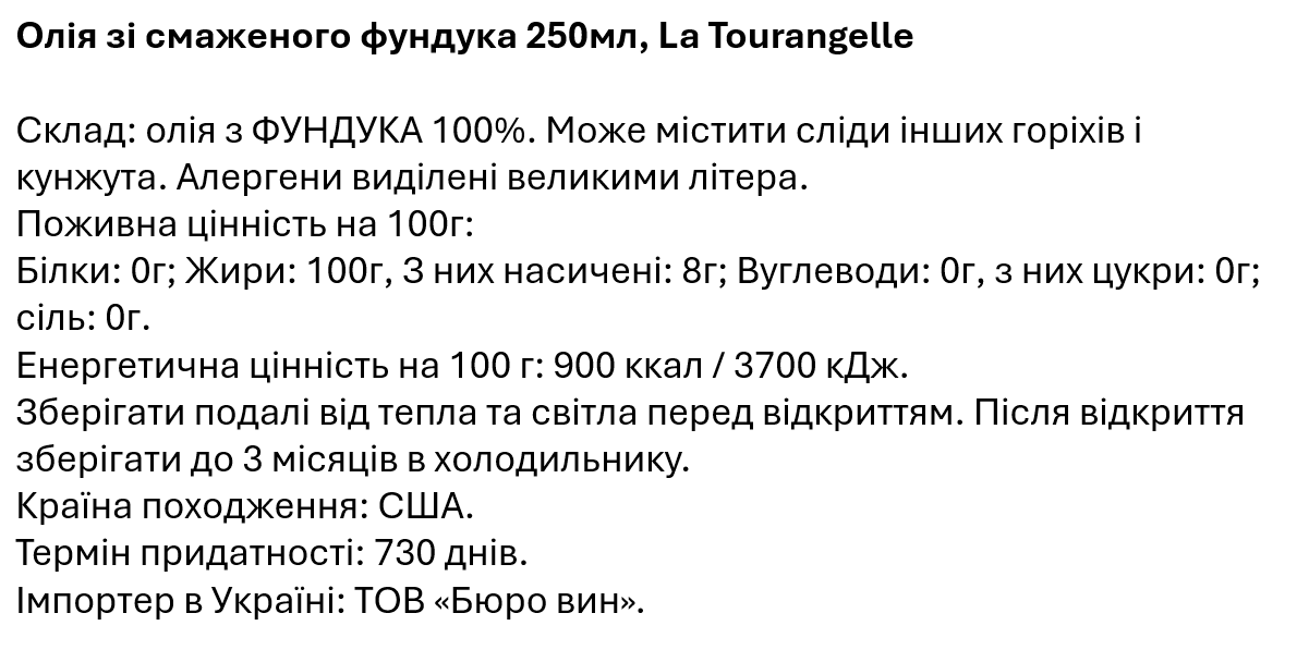 Продукт обладает насыщенным, глубоким ореховым вкусом и ароматом, сохраняет все полезные свойства фундука. После открытия бутылки масло следует хранить в прохладном тёмном месте до 730 дней.