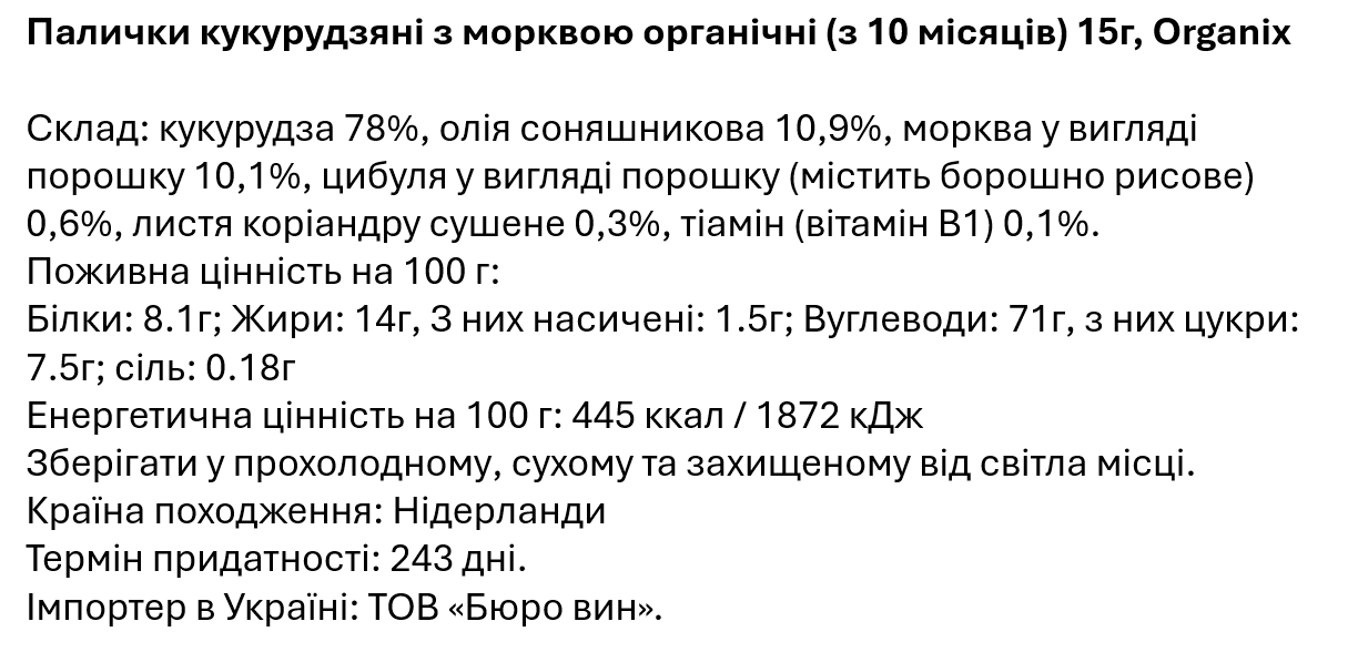 Лёгкие и хрустящие палочки из кукурузы, дополненные морковным порошком, станут идеальным перекусом для малышей от 10 месяцев. В состав снеков входят: кукуруза, подсолнечное масло, морковный и луковый порошки, а также сушёные листья кориандра. Кукурузные снеки с морковью Organix легко тают во рту, обеспечивая безопасное и приятное знакомство малыша с новыми вкусами. Снеки изготовлены без искусственных добавок и консервантов, что соответствует принципам бренда Organix. Удобная упаковка (15 г) позволяет брать кукурузные палочки с собой на прогулку или в дорогу.