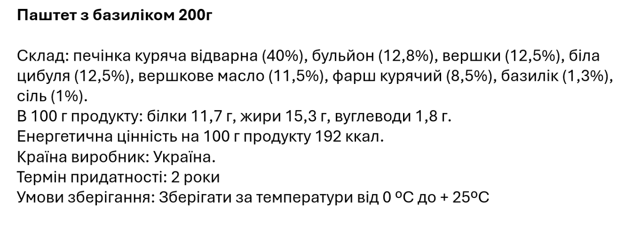 Мясное «сердце» паштета — отварная куриная печень высшего сорта и ароматный куриный бульон. Паштет напоминает лёгкий крем благодаря сливочному маслу и добавленным сливкам. Глубину вкуса подчёркивает пассерованный белый лук, а неповторимость — душистый базилик.