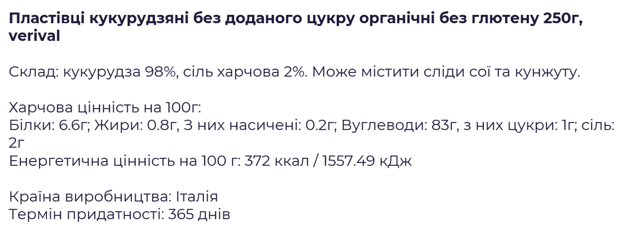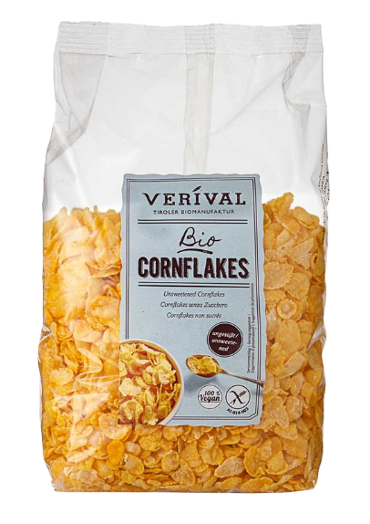 Verival — австрийский бренд, известный своими органическими продуктами для здорового завтрака. Компания специализируется на производстве мюсли, гранолы, каш быстрого приготовления и снеков без искусственных добавок. Продукция бренда соответствует высоким стандартам качества ЕС. Органические кукурузные хлопья от Verival подходят тем, кто ищет натуральный, полезный и диетический завтрак. Для изготовления хлопьев кукурузу сушат и очищают от лишних примесей и шелухи. Чтобы приготовить завтрак с кукурузными хлопьями, добавьте в миску 50 граммов продукта и стакан молока растительного или животного происхождения. Также вкус кукурузных хлопьев отлично сочетается с классическим или греческим йогуртом.