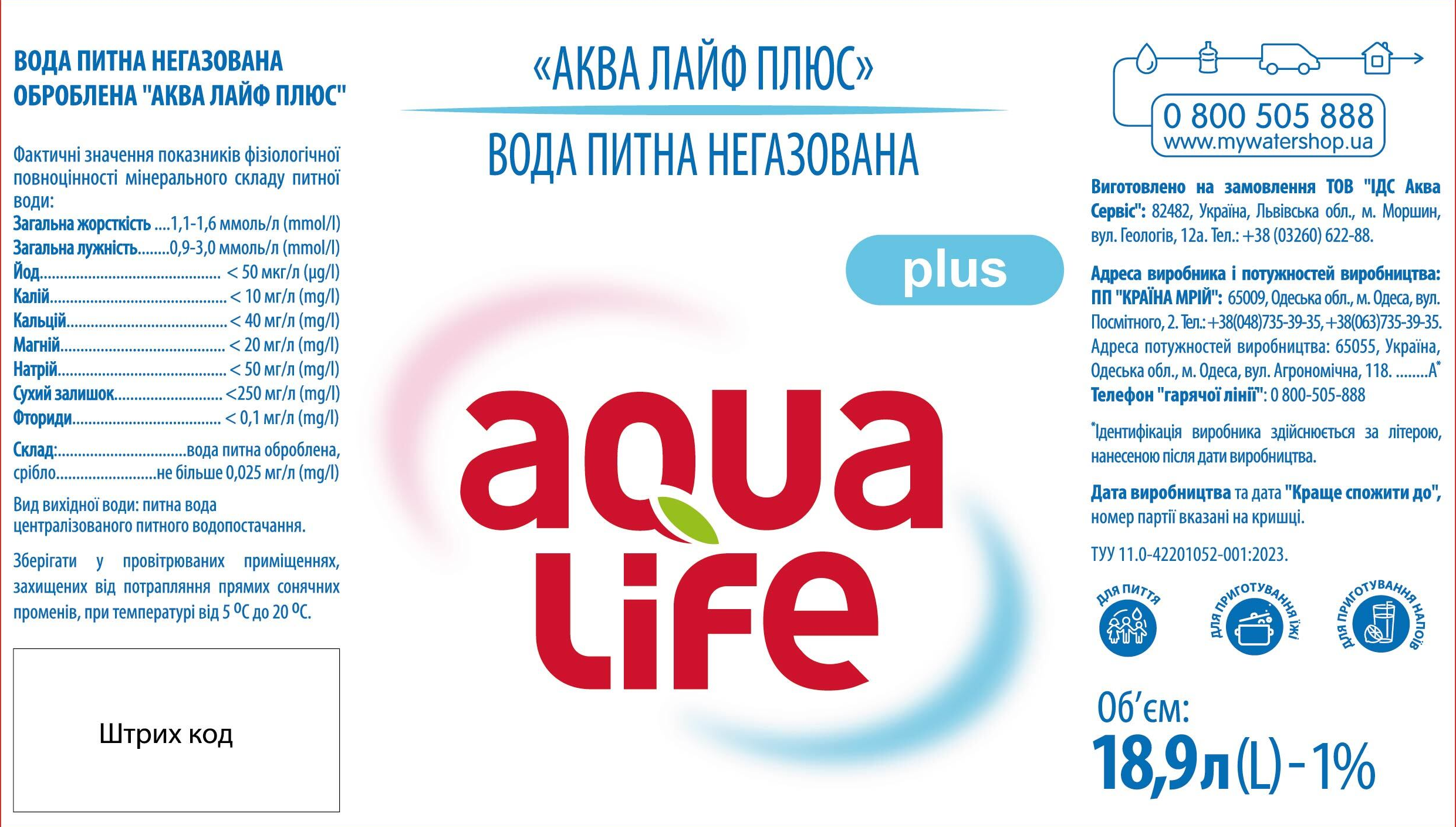 "Аква Лайф Плюс" объемом 18,9л. Это питьевая, бережно обработанная вода с содержанием солей кальция и магния с учетом потребностей потребителей и приятным сбалансированным вкусом..